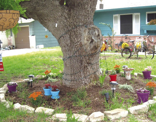 Garden ornaments abound at the Natal home, both in planting beds and even up on tree limbs. Numerous bird houses are put out each spring, and feeders are available for birds year around. On the back of the lanai hangs a weathered sign from Paper Bear, the historic San Marcos downtown store where daughter Cathy worked for three decades when she wasn’t busy tendunforgettable ing the home landscape. Linda claims she lacks Cathy’s green thumb but is keeping up a family legacy. Even a quick view of the Natal landscape shows her success.