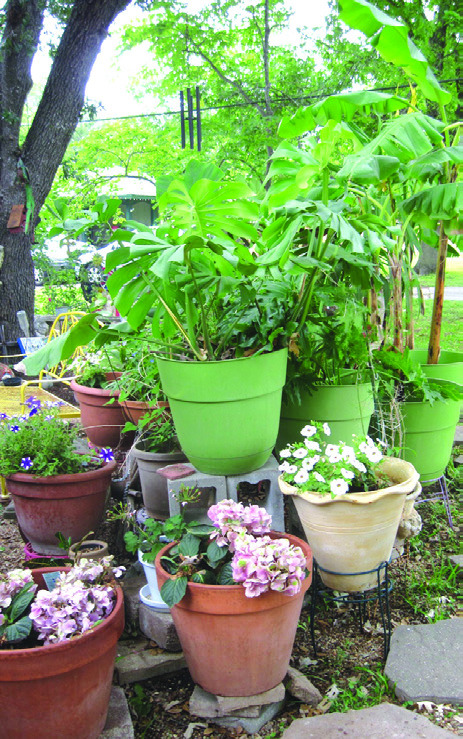Spring flowers join splitleaf monstera and banana trees in backyard pots. Photo by Sharon Lockett