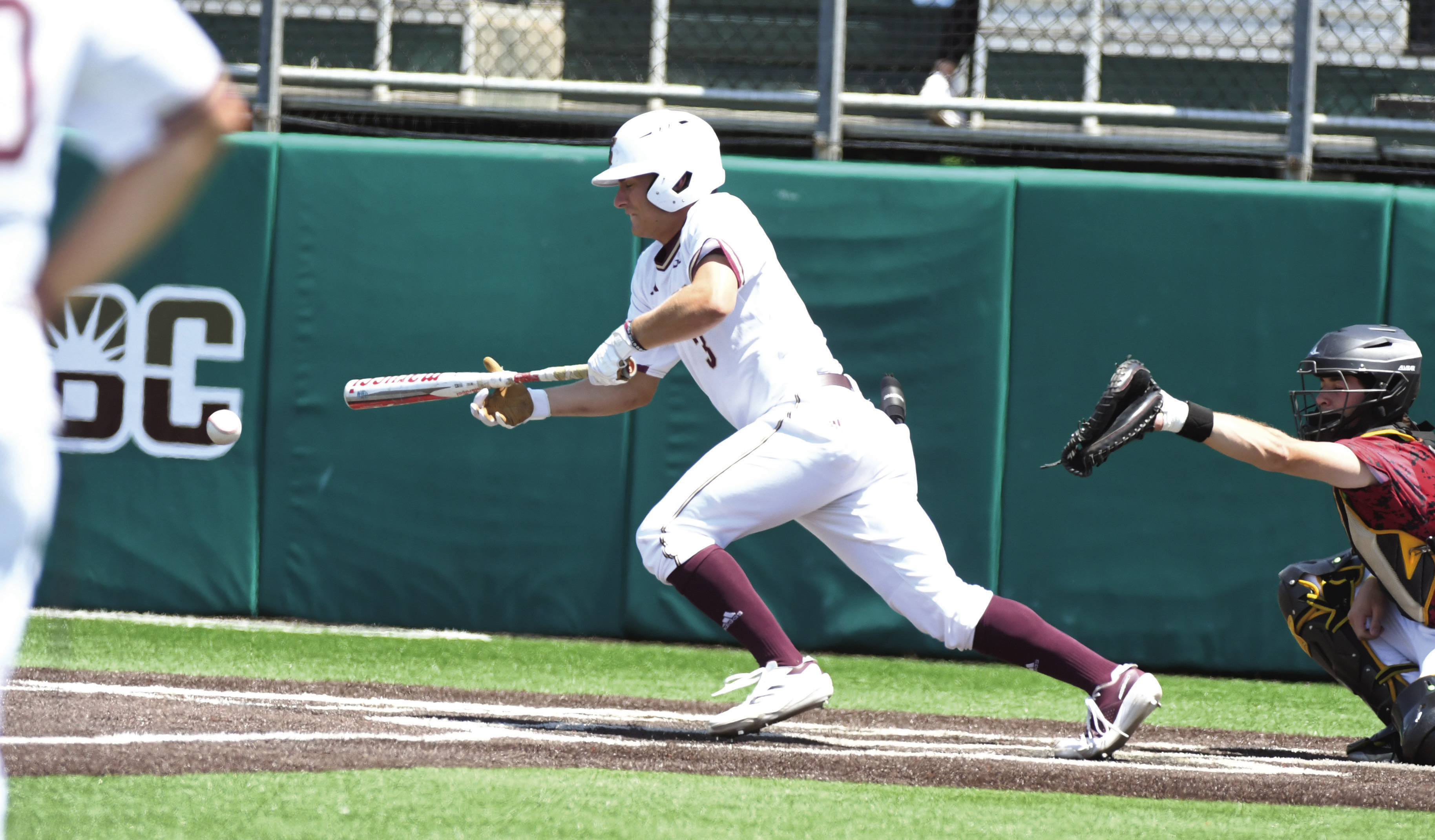 Sophomore Ryne Farber lays down the bunt in the Bobcats win over the Warhawks on Saturday. Texas State goes on the road this weekend for another crictical series against Georgia Southern. Daily Record photo by Gerald Castillo