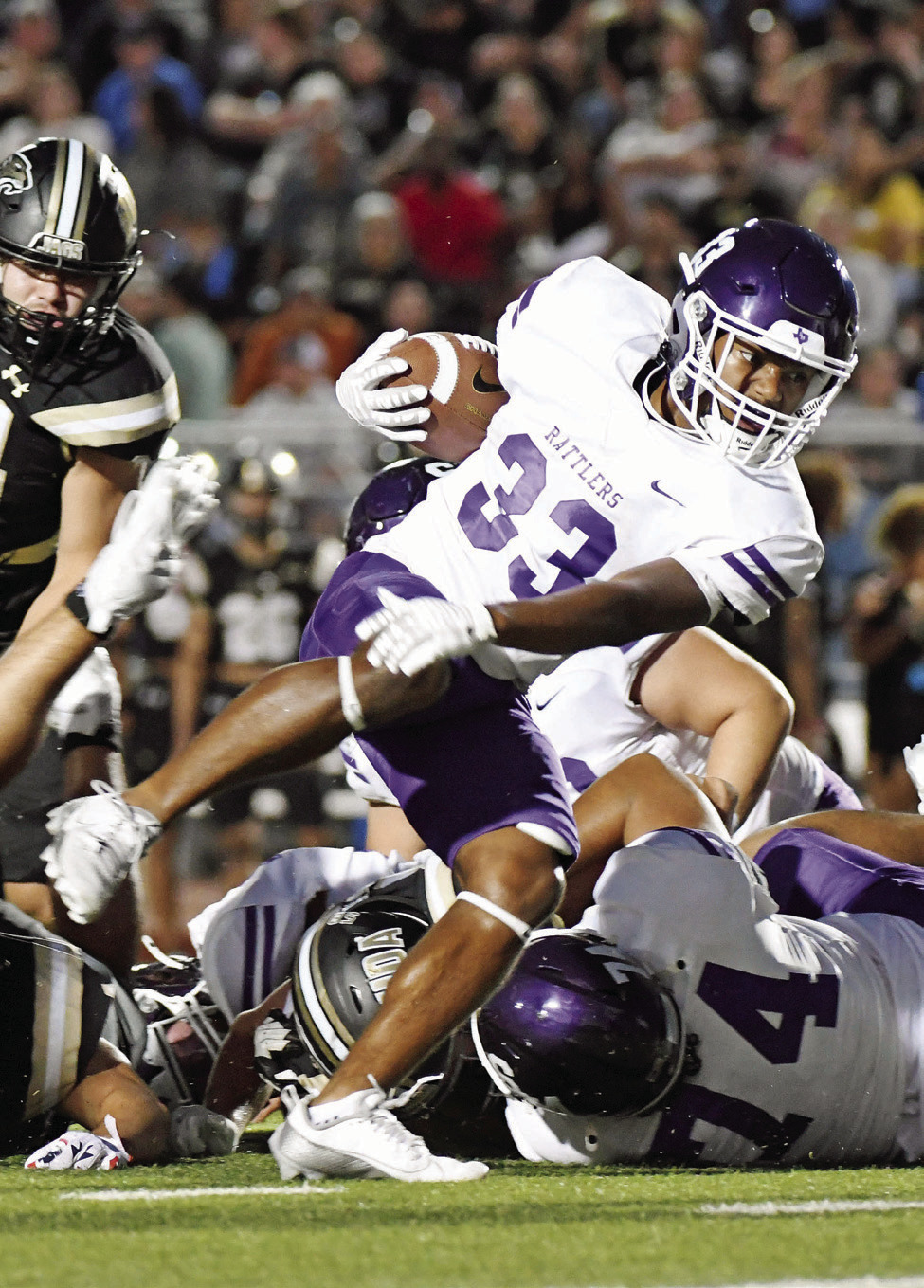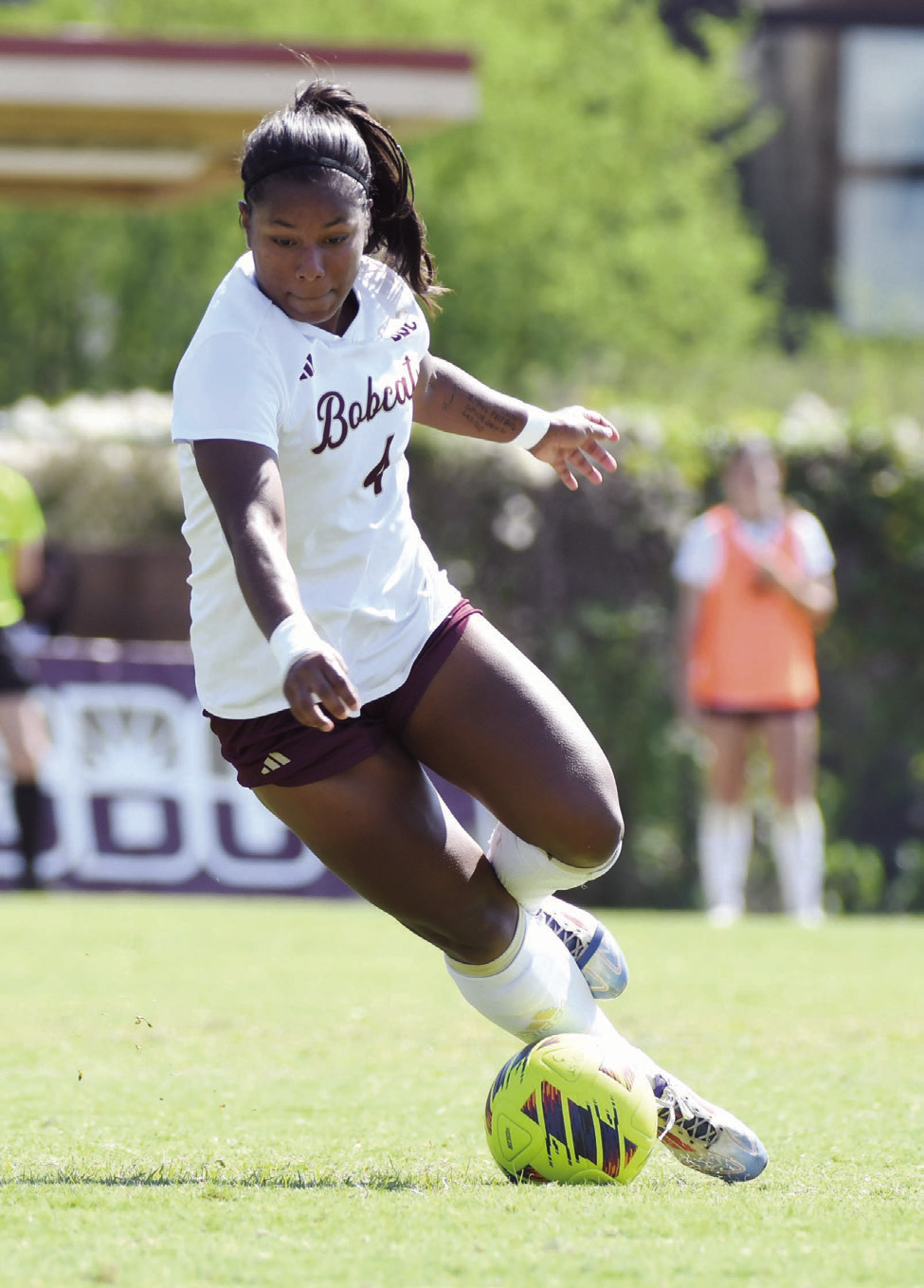 Left, running back Ismail Mahdi delivers the stiff arm in the Bobcats 45-10 win over UTSA. Middle, Donovan Garcia keeps his balance in the Rattlers road game against Buda Johnson. Right, Victoria Meza dribbles the ball in the Bobcats home game against Louisiana Monroe. Daily Record photo by Gerald Castillo