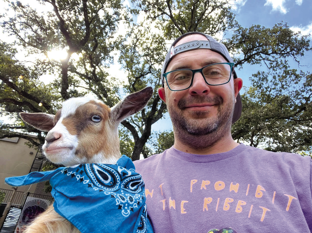 Texas author Ted Akin describes himself as a “dork, farmer, rural mental health advocate, writer, desert hippy and world’s okayest musician.” Goat may or may not be a unicorn. Photo submitted by Horse & Heart Productions