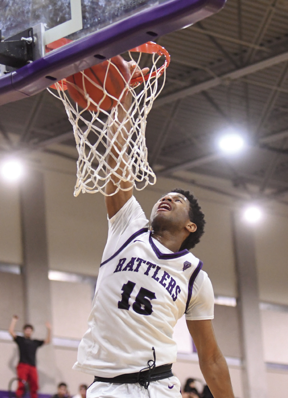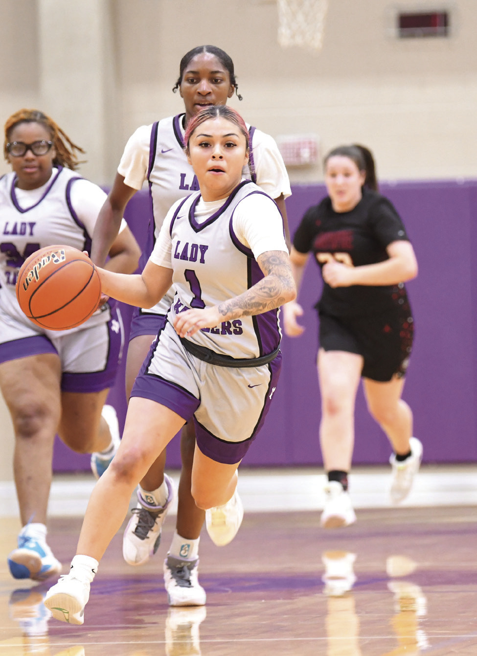 Left, Ja’Mia Harris hits the jumper in the Bobcats game against South Alabama. Middle, Josiah Hollmon throws down the dunk in the Rattlers home game. Right, Ezra Tobias leads the Lady Rattlers on the fast break attempt in San Marcos home win against Austin Bowie. Daily Record photo by Gerald Castillo