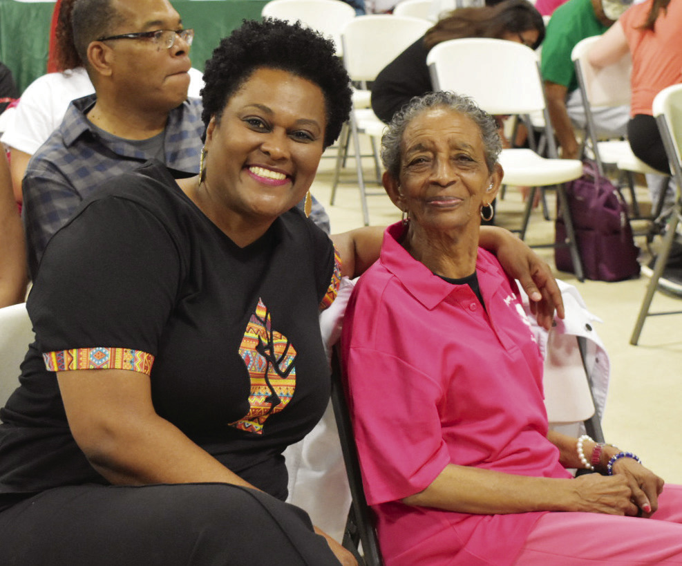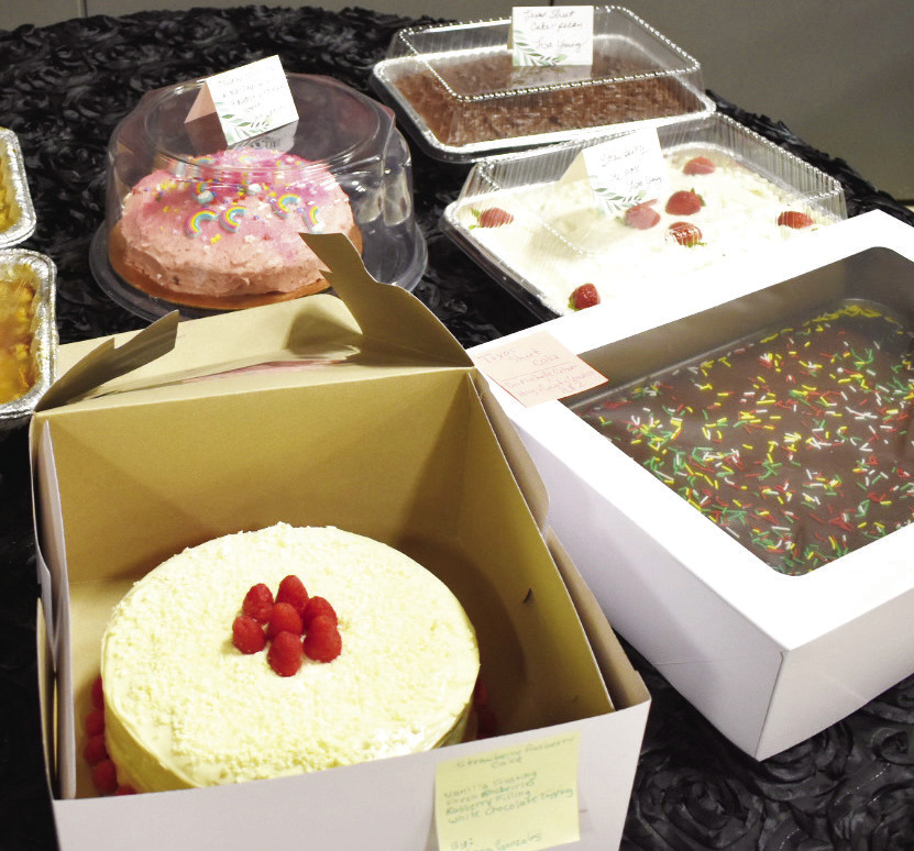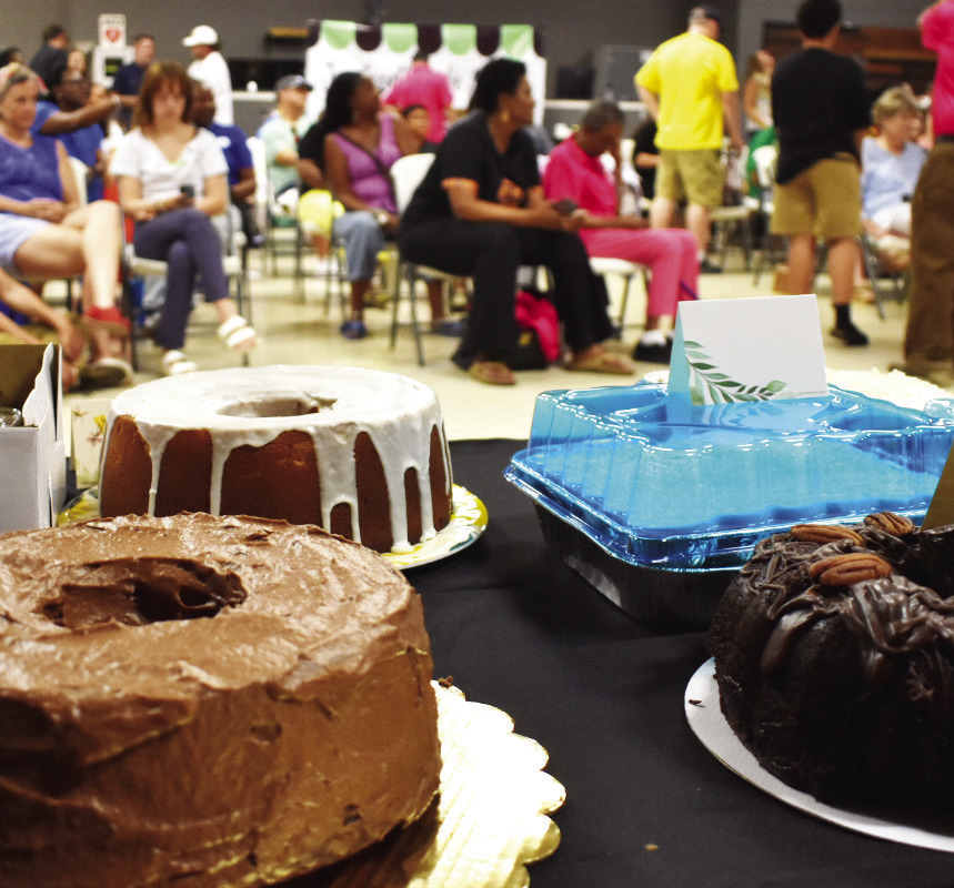 Above, David Peterson, the Juneteenth Foundation President was the auctioneer at the event, keeping spirits high and energy up during the bidding process. Left, Martha Castex-Tatum poses with Rose L. Brooks at the 46th Annual Juneteenth Cake Auction. Below, a variety of cakes and desserts were bid on to raise scholarship funds. Daily Record photos by Rebekah Porter