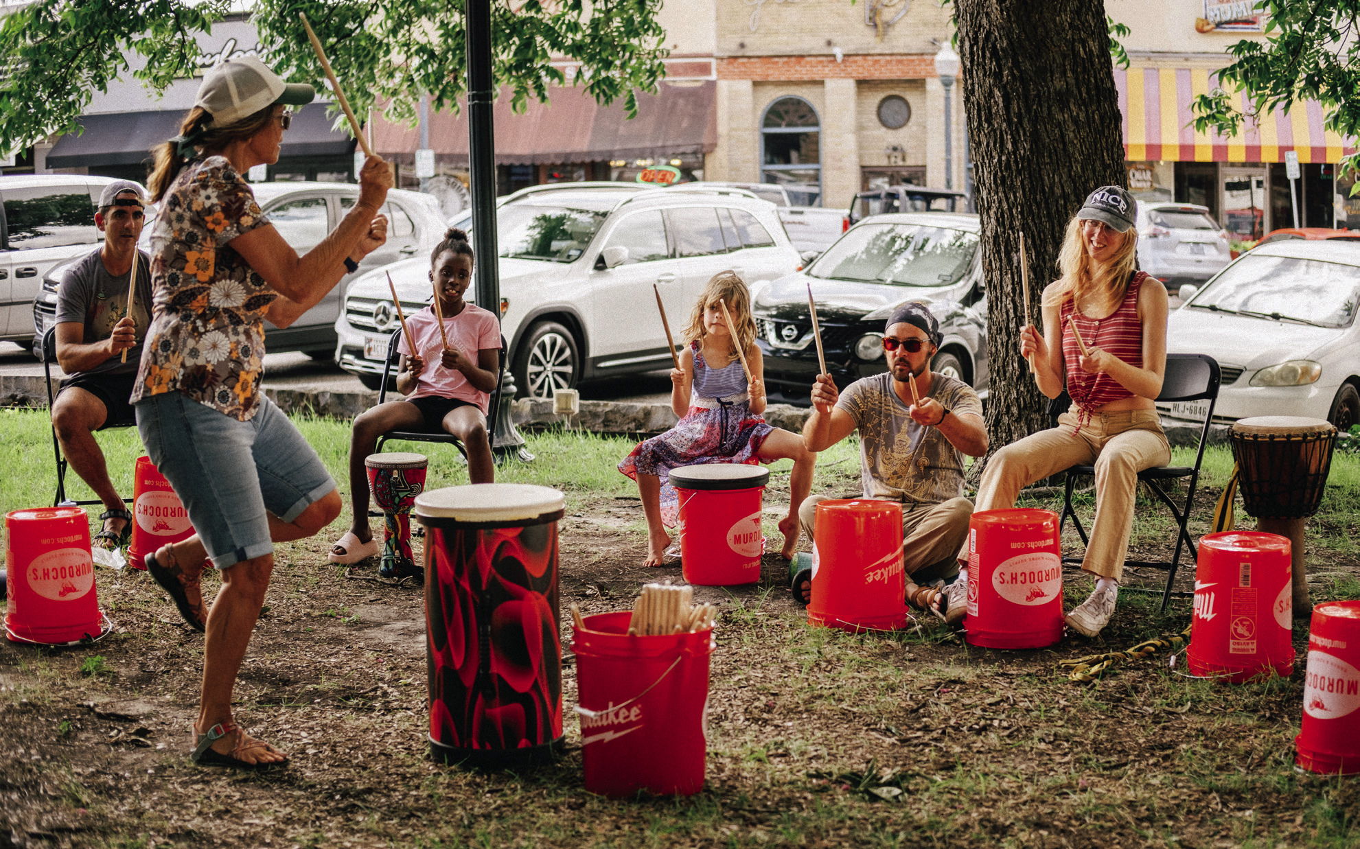 This year the Listen San Marcos team set up a bucket drumming circle at the Historical Hays County Courthouse lawn that was accessible to anyone and everyone interested in drumming it out.