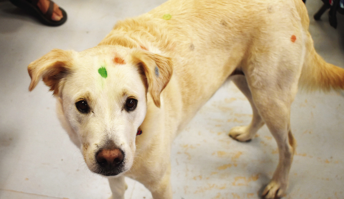 Above, B-I-N-G-O MC Tawni Sheldon calls out winning numbers during the Eye of the Dog’s fundraiser event Below, Steve the dog looked more and more like a B-I-N-G-O scorecard as the event went on. Daily Record photos by Rebekah Porter