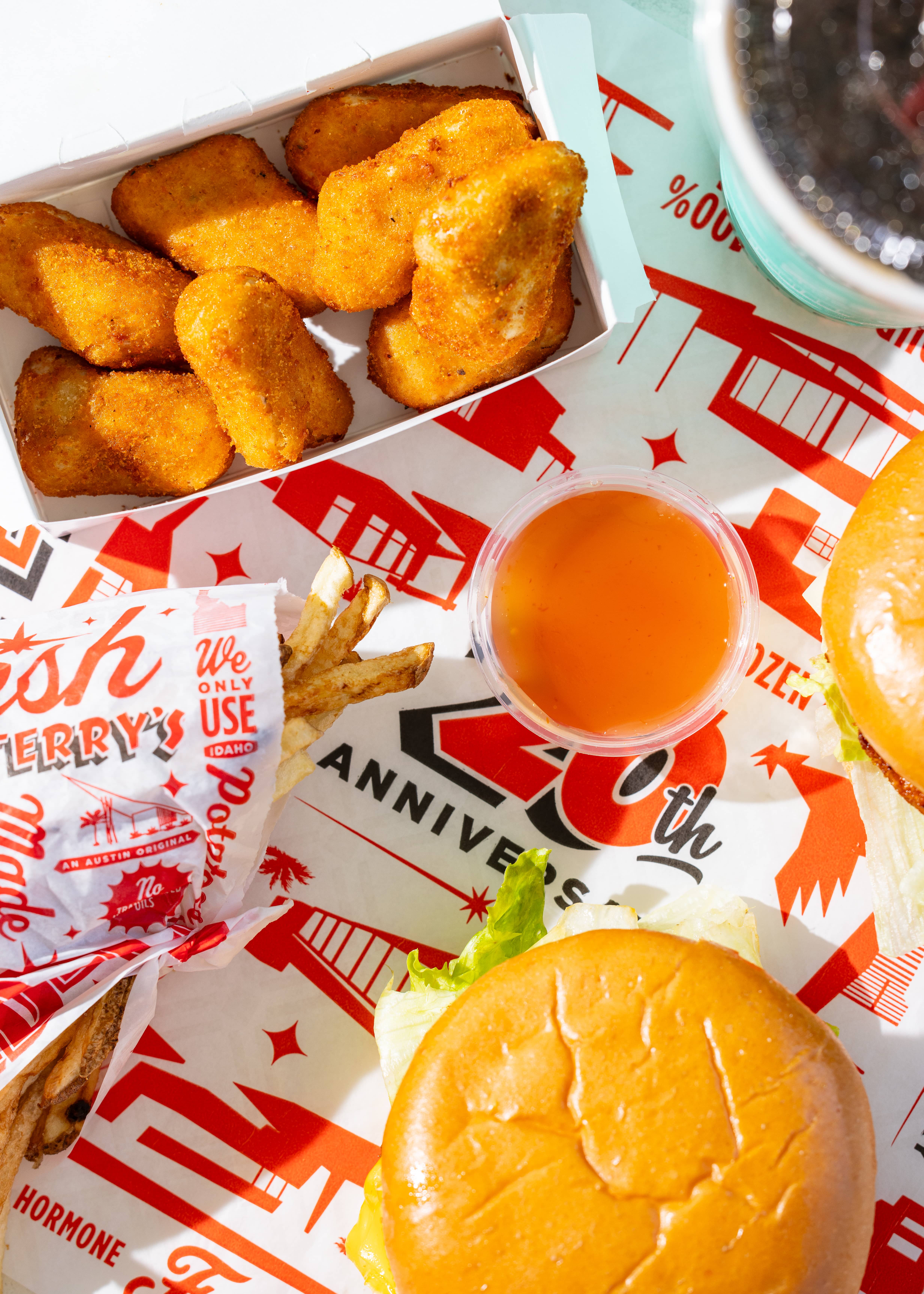 A P. Terry’s Burger Stand is hard to miss with red and teal elements catching one’s eye as unique and intriguing retro architecture draws one in. The visual intrigue is rewarded with a delicious burger made from fresh local ingredients. Central Texas has been home to the burger stand since Patrick and Kathy Terry opened their first location on July 5, 2005 on the corner of South Lamar and Barton Springs in Austin. Their mission has been to provide guests with all natural food free of hormones and antibiotics at an affordable rate. In those 20 years, the company has expanded to 37 locations now serving San Antonio, Austin, Houston, San Marcos and many other cities throughout Central Texas.