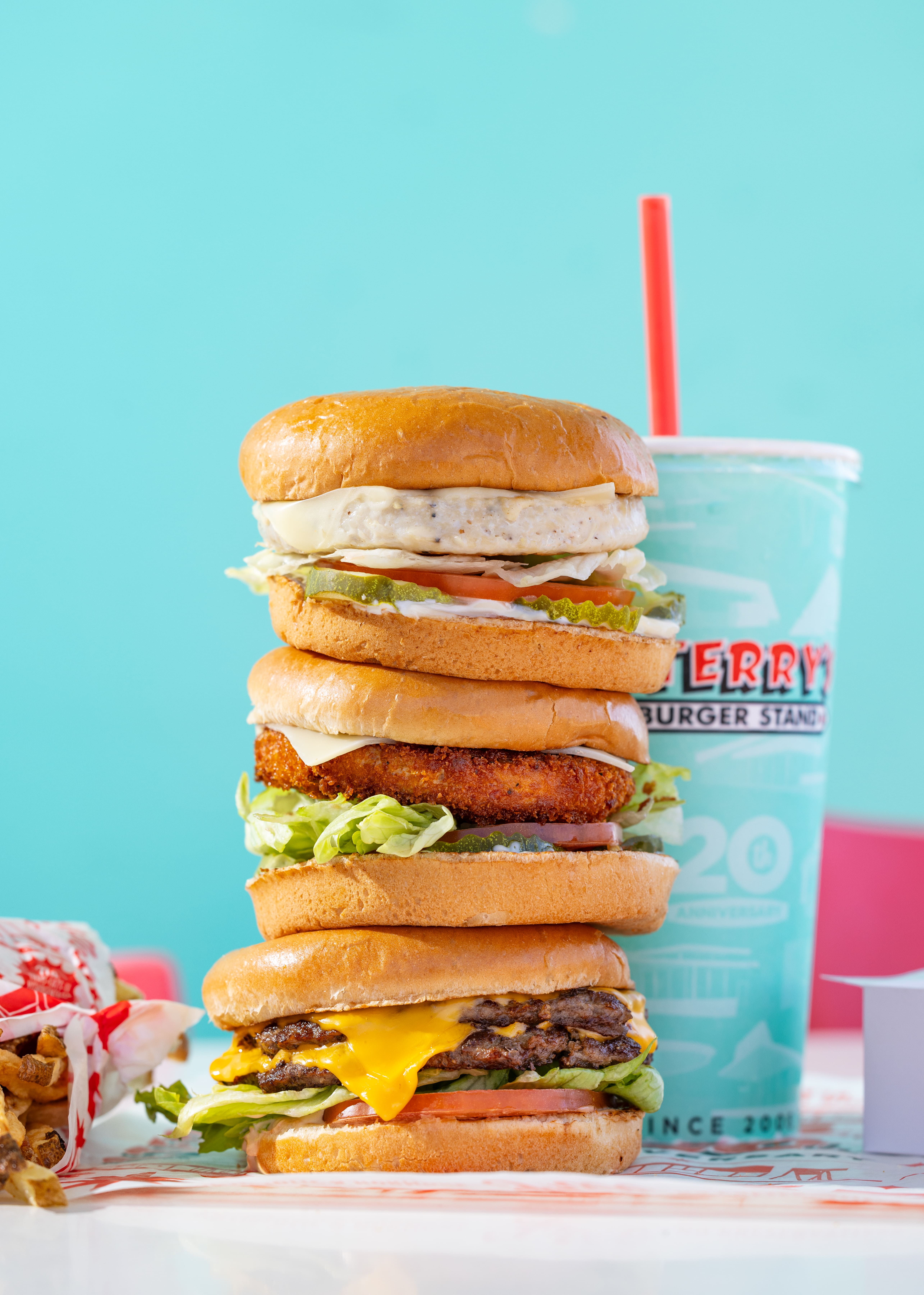 A stack of P. Terry's burgers including their Double Cheeseburger, the Crispy Chicken Burger and their Chicken Burger.