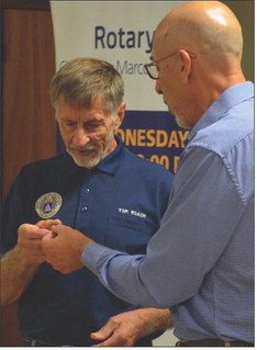 Tom Roach receives a Rotary coin from Sammy Falletta, Rotary Club of San Marcos co-president. Daily Record photo by Shannon West