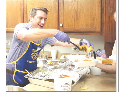 Rotary member David Case serves up plates of Rogelio’s enchiladas, rice and beans for the August Cottage Kitchen luncheon. Daily Record photo by Celeste Cook