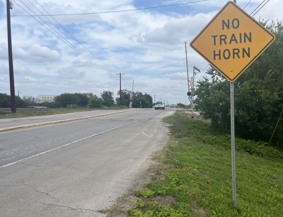 A crossing in San Marcos includes a ‘no train horn’ sign to inform residents. Photo courtesy of the city of San Marcos