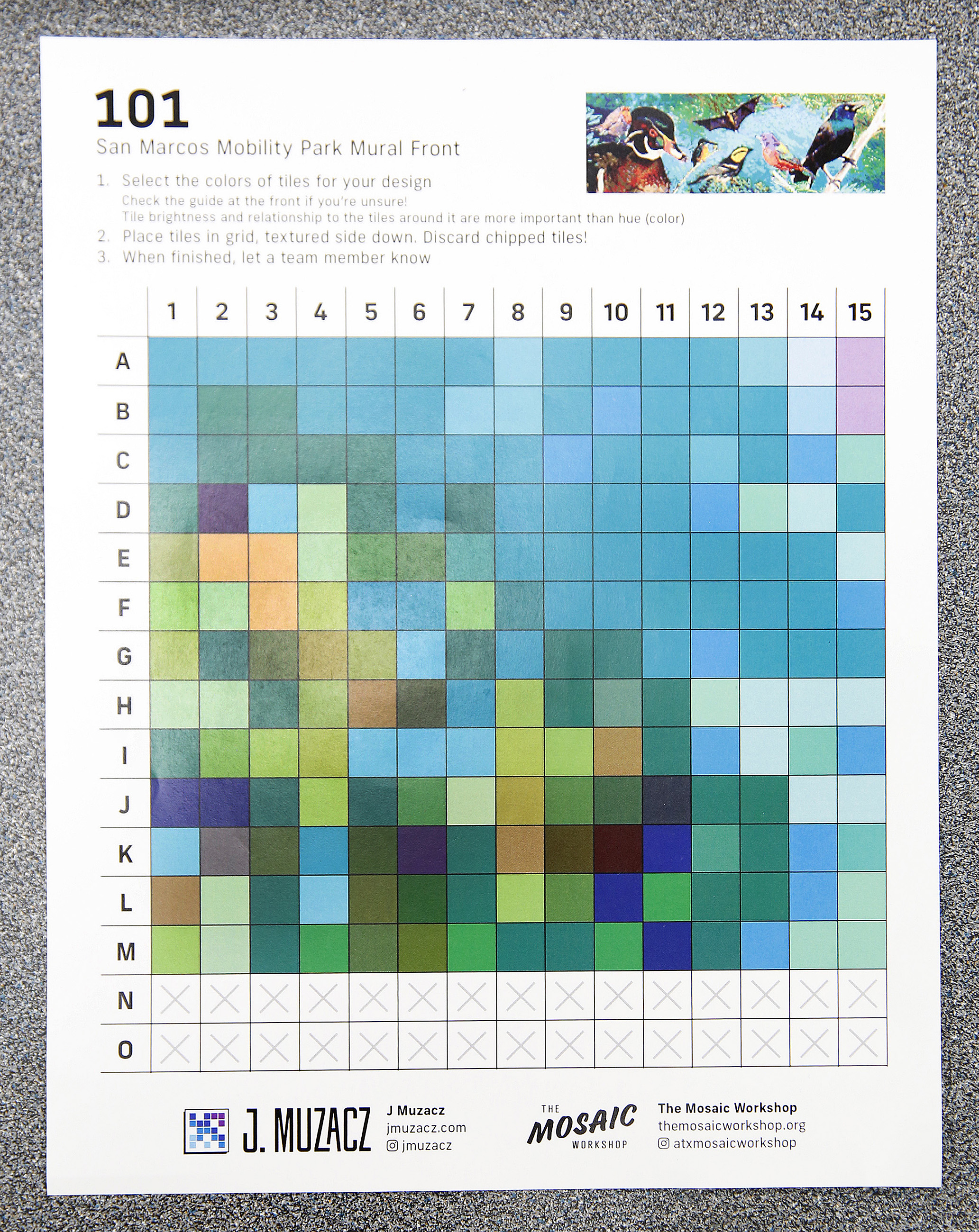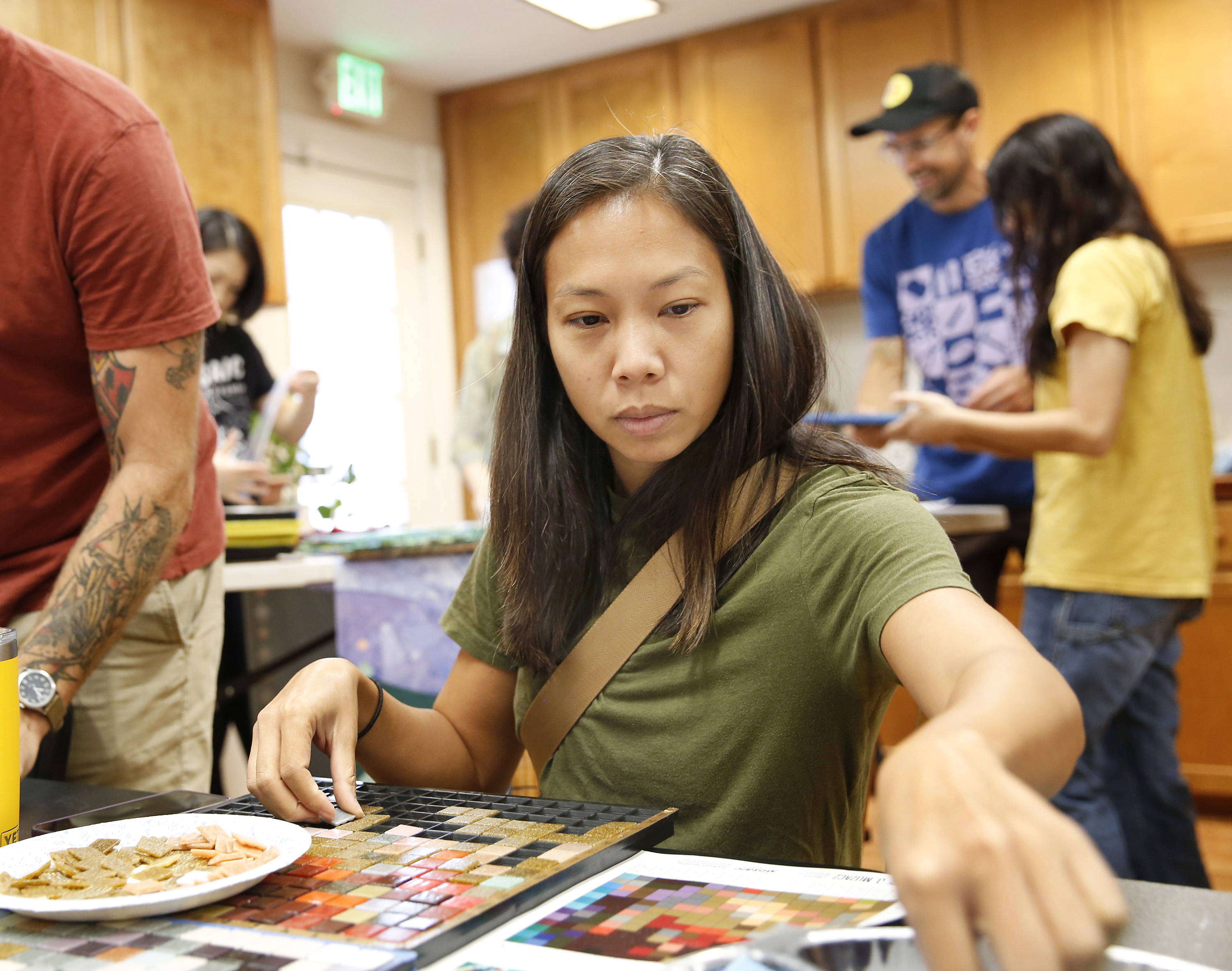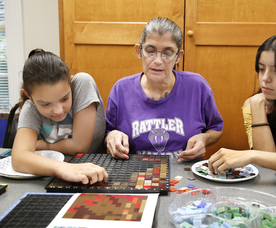 San Marcos resident Michele Donnelly said the workshop was a fun way to meet people and collaborate with the community, creating a personal work that merges with the community vision. The tiles were often not an exact match to the printouts, giving participants creative options to fill their tile grids.