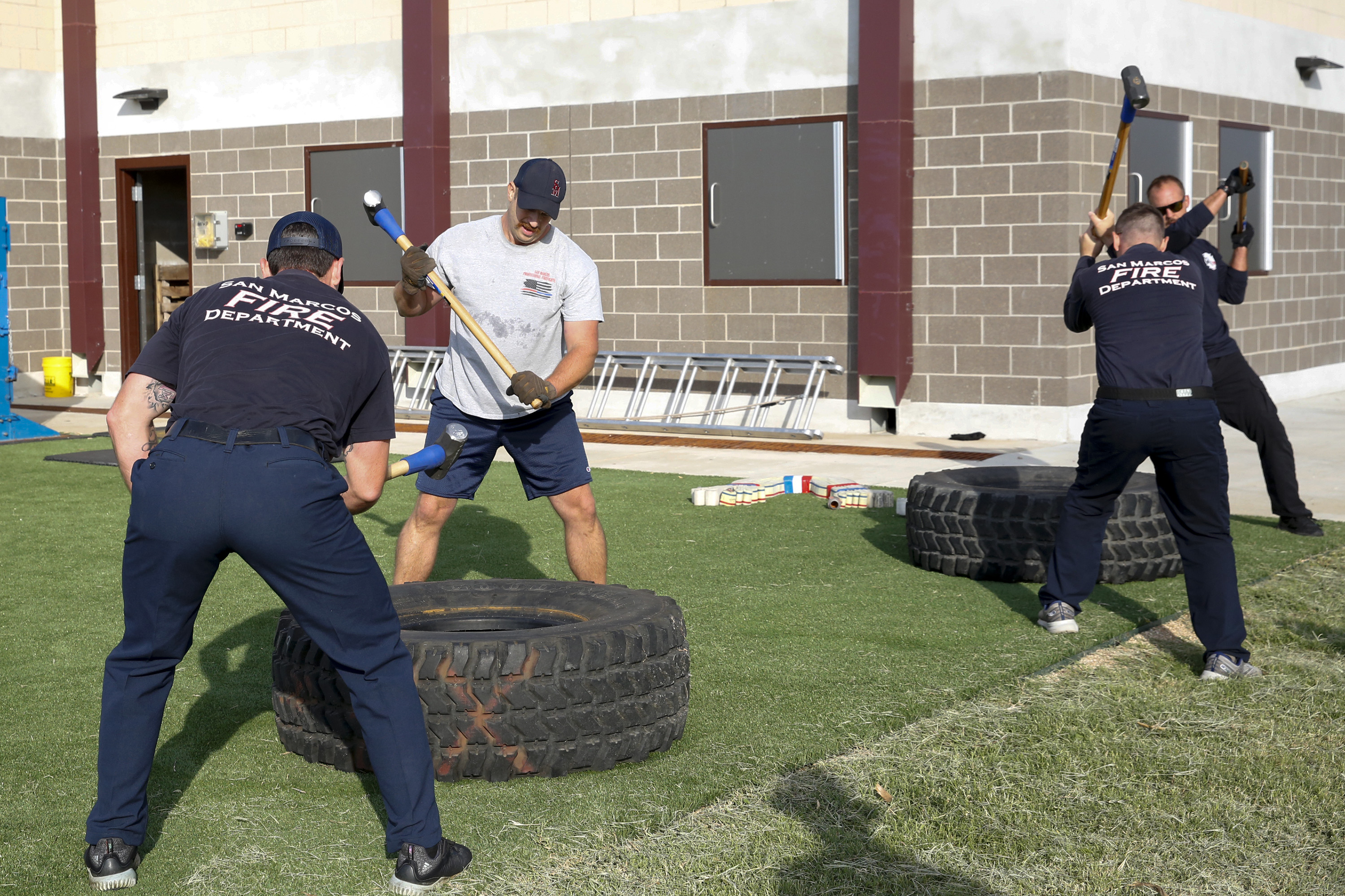 The San Marcos Fire Department paid homage to New York firefighters Thursday at the SMFD Fire Training Facility with a series of workouts designed to reflect the hurdles faced by the FDNY on 9/11.
