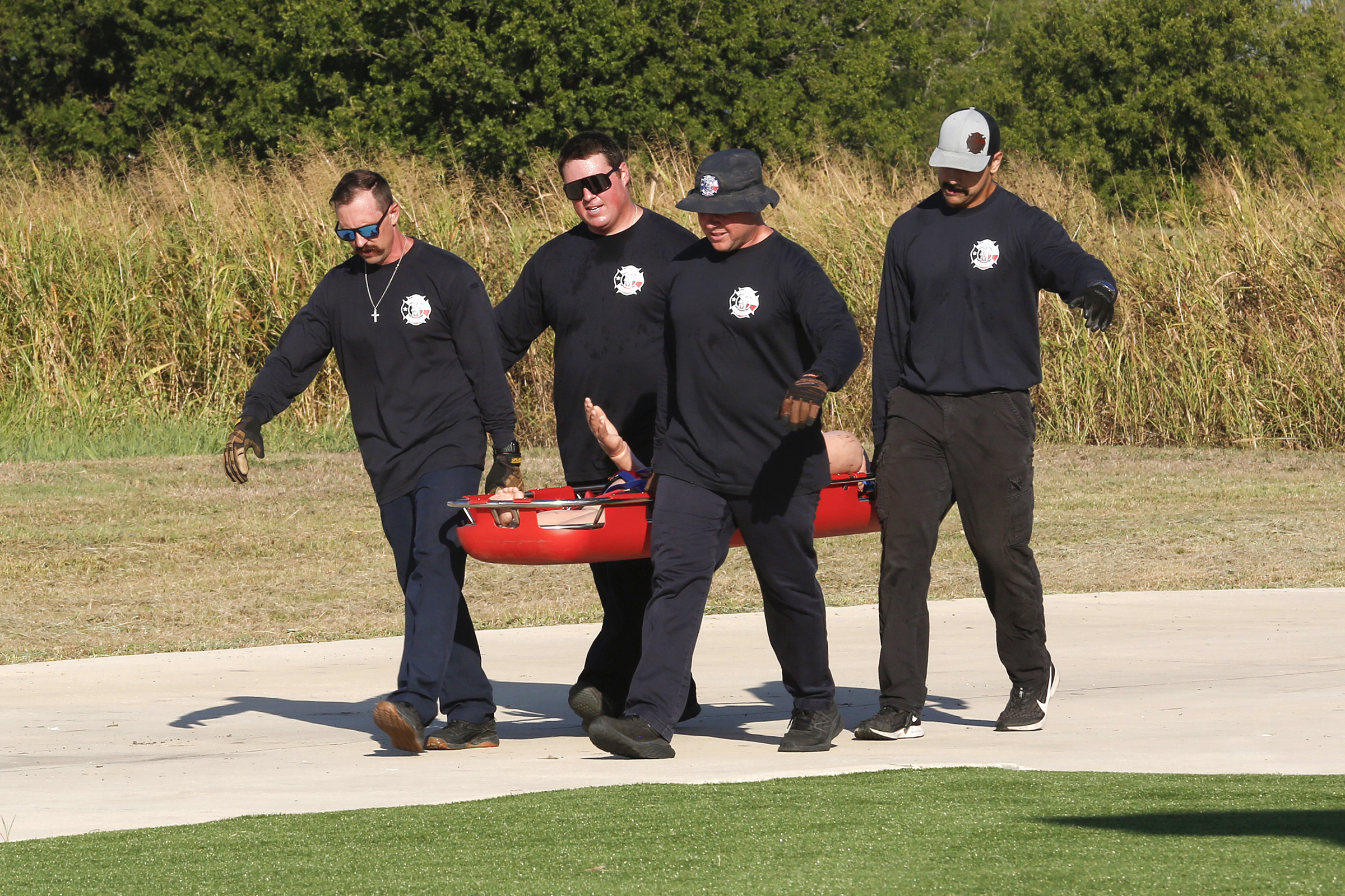 Rescue Carry, a quarter-mile walk around the perimeter of the training facility, with all four team members carrying the 175-pound training manikin Rescue Randy on a stretcher. “This challenge simulates extracting a victim from a collapsed zone to a medical group or staging a way to a safe environment for treatment.”