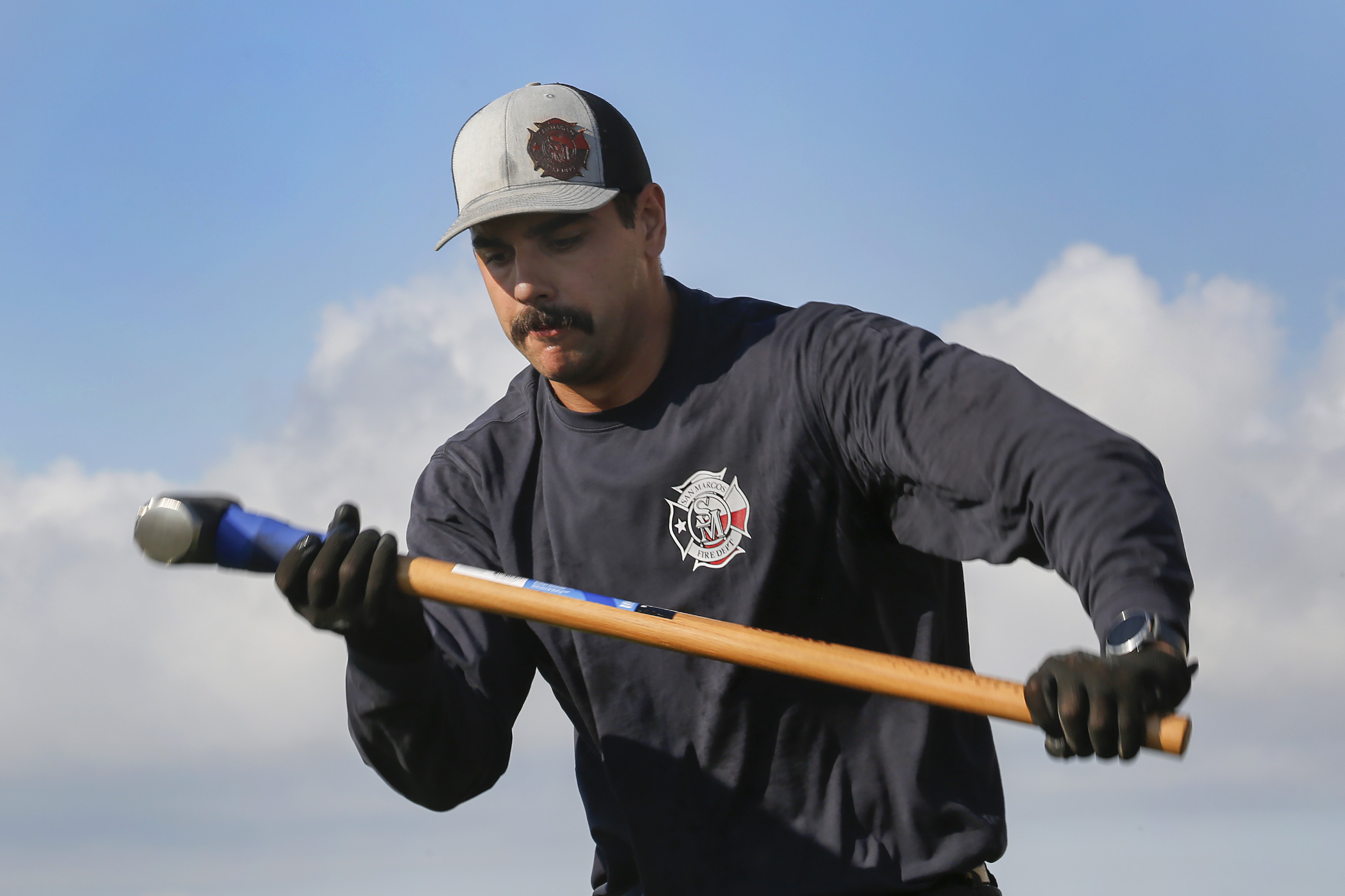 Breach Point, which involves 20 swings with an eight-pound sledge hammer against the fire truck tires. “This challenge simulates efforts to force entry through steel doors and fallen debris,” Hanks said.
