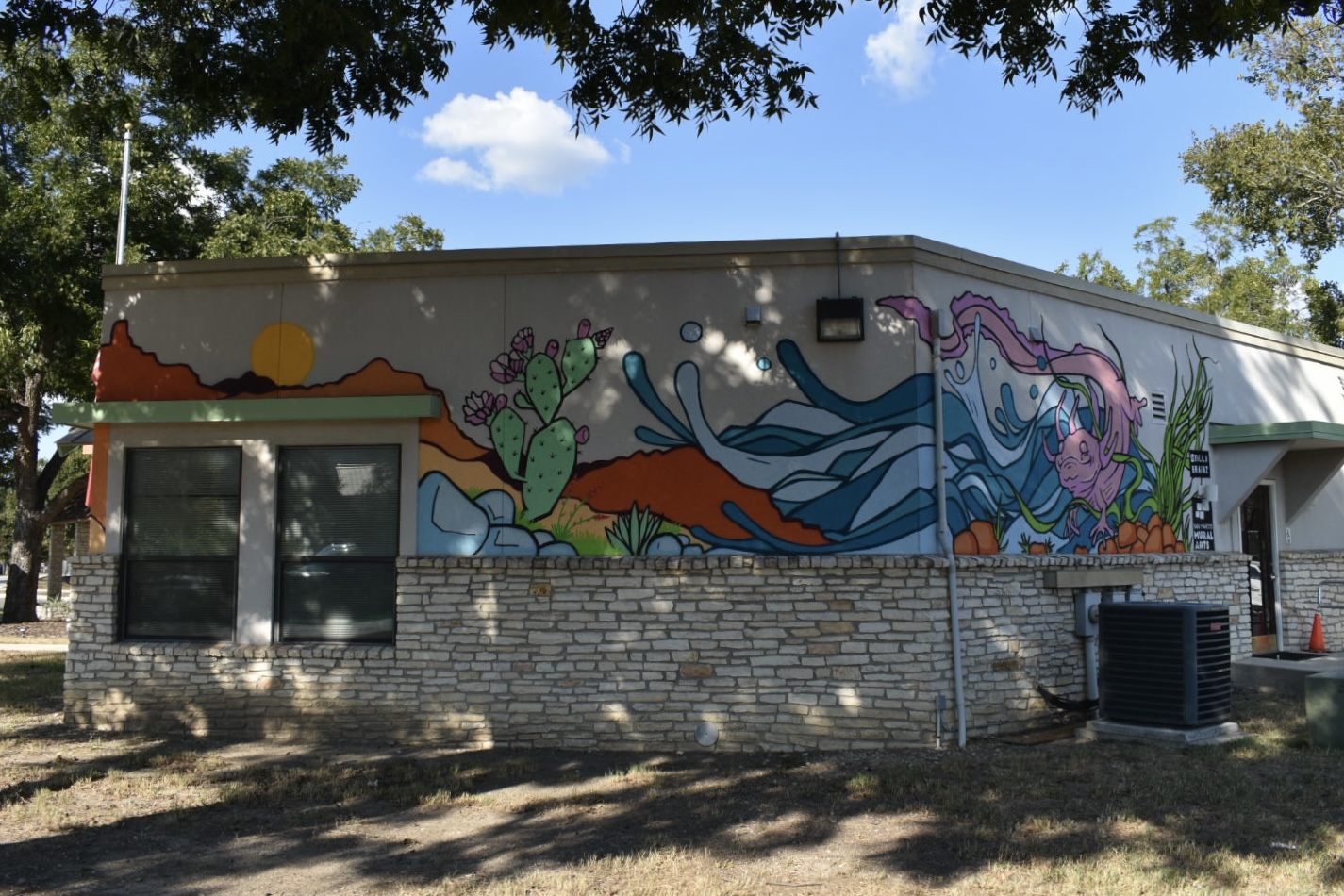 The Chamber building has been functioning as a source of commerce and community connections for over 50 years. Nestled adjacent to the San Marcos River, the fantastical flora and fauna depictions in the mural act as a gateway from city departments to city parks.