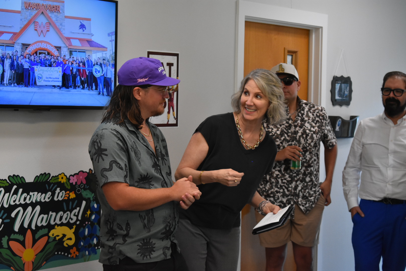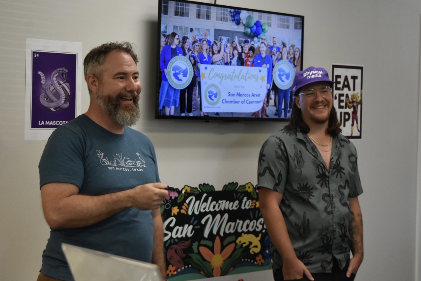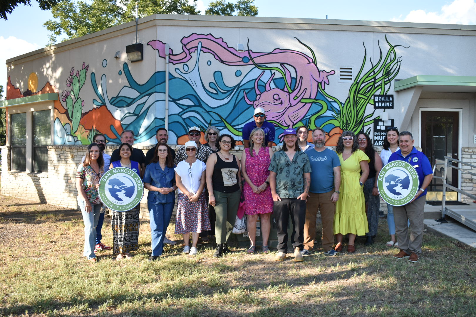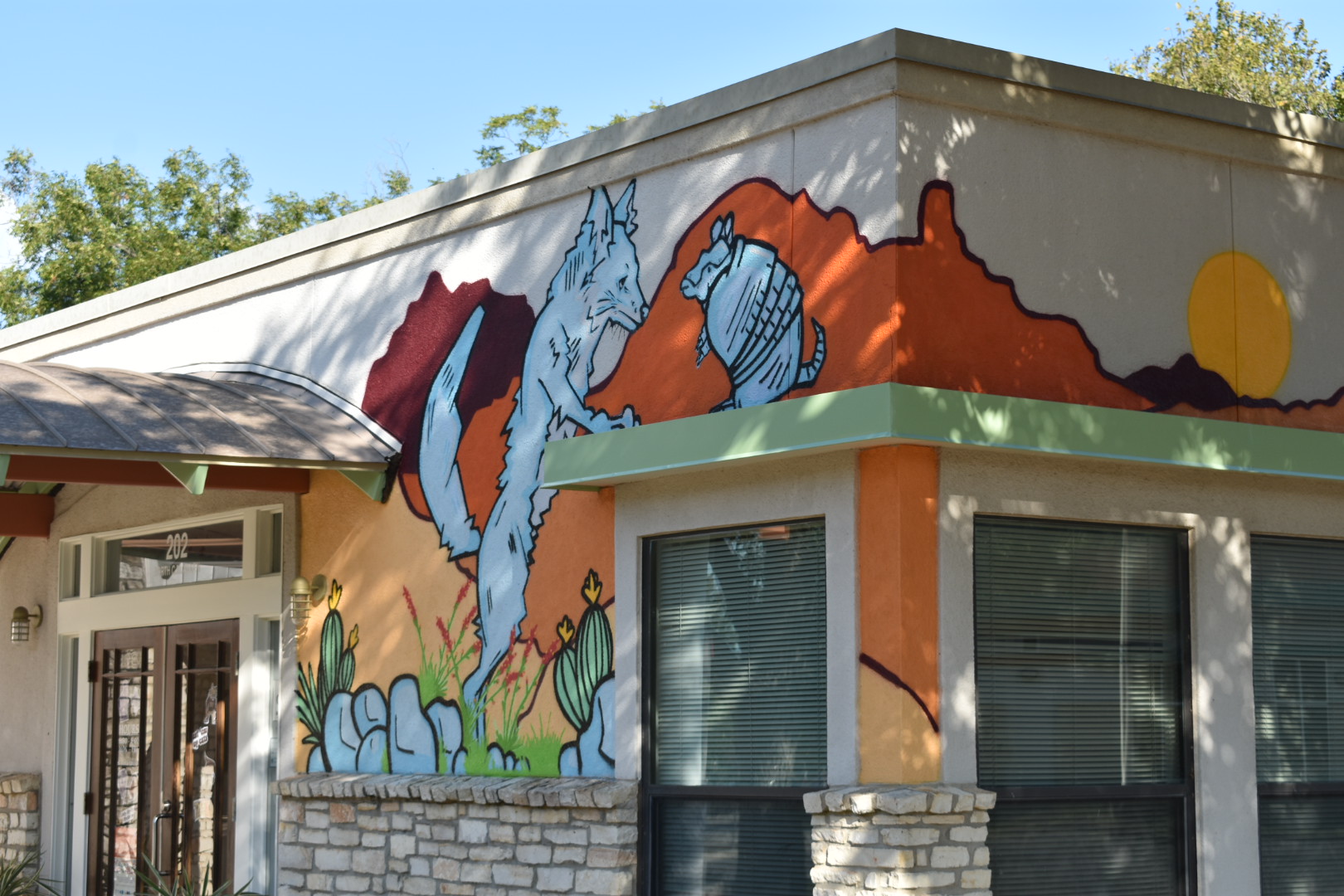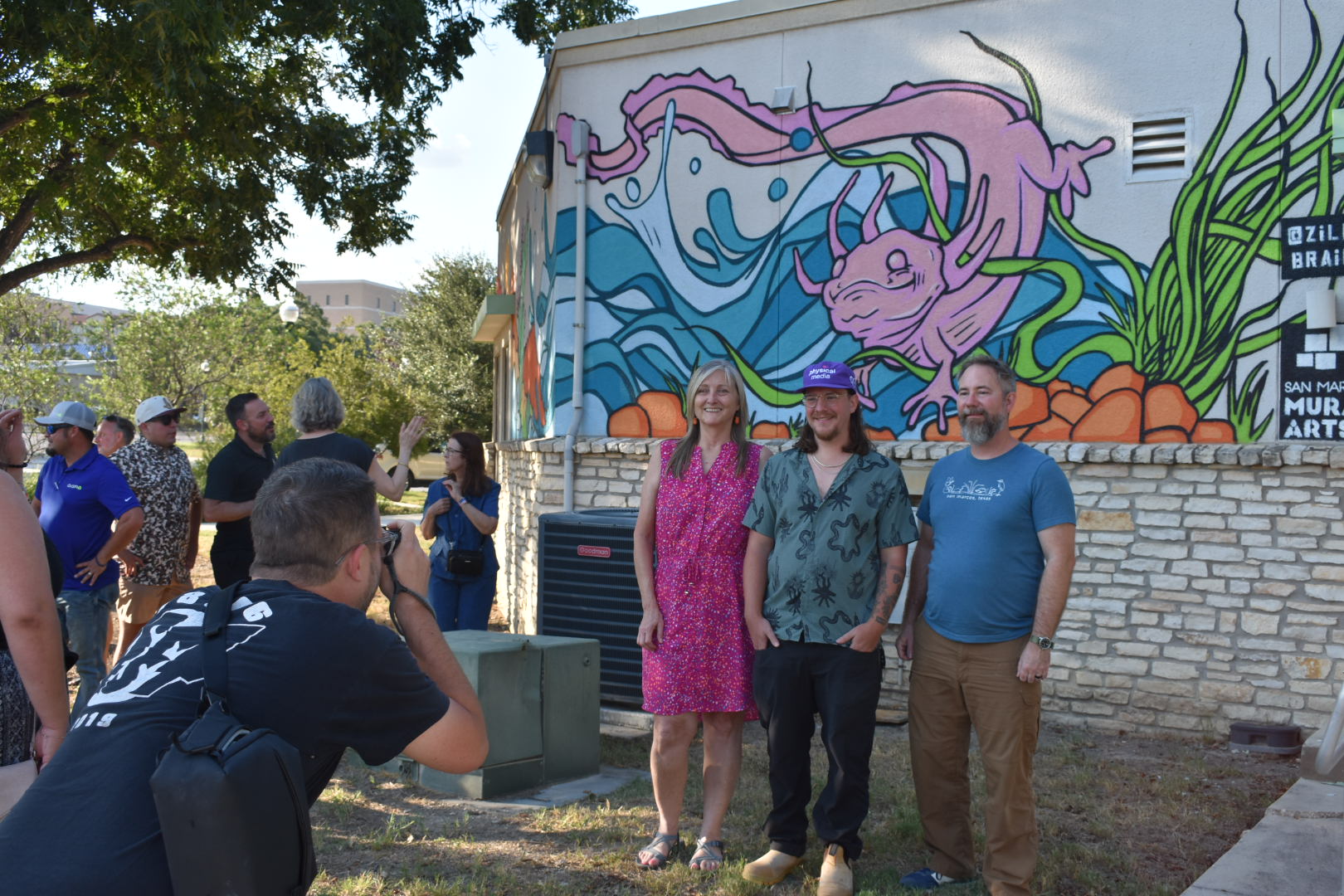 “We really feel that this mural captures the spirit of San Marcos, the fox and the armadillo and the salamander, and it reminds us every day about these special creatures that live alongside us as we do our work,” Chamber President & CEO Page Michel said.