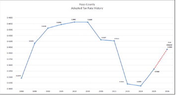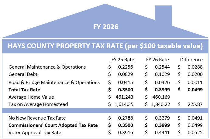 Following a final public hearing on Sept. 16, the Hays County Commissioners Court voted, 4-1, to adopt a tax rate of $.3999 per $100 valuation and a balanced budget for fiscal year 2026.