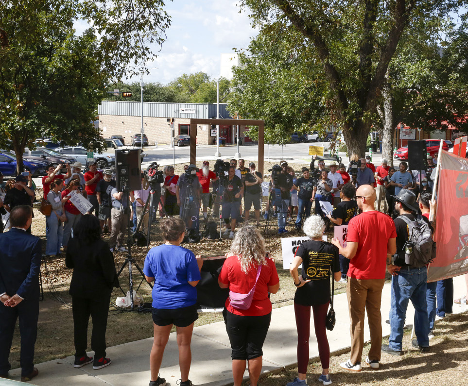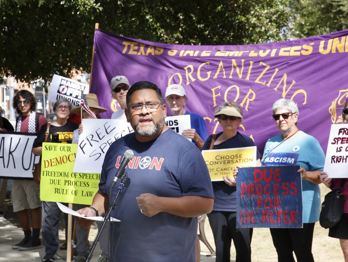 More than 100 people, including union representatives, local government officials, and Texas State students and professors, gathered at the Hays County Courthouse Thursday to protest the firing of TXST professor Thomas Alter. The importance of free speech and the dangers of placing limits on it were common threads, with speakers warning that the Alter case would have implications for not only the academic community, but for all of Texas workers.