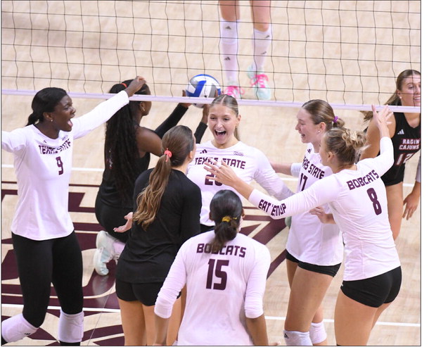 Texas State bounced back from their Friday loss to sweep the Louisiana Ragin’ Cajuns 3-0 [31-29, 25-19, 25-18]. The Bobcats will look to continue their success on the road against Troy this Thursday. Daily Record photo by Gerald Castillo