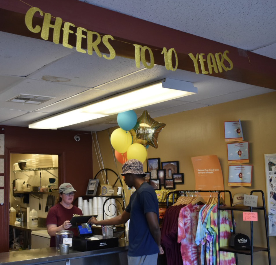 The shop went all out for the event with sparkling decorations, a raffle where guests could win merchandise or gift cards, and a special anniversary menu deal including free meals for kids and a free Mediterranean dessert for guests with a sweet tooth. Locals flooded the restaurant to celebrate the co-owners and their staff, reflecting on the past ten years. The co-owners predict that two thirds of their customers are regulars.