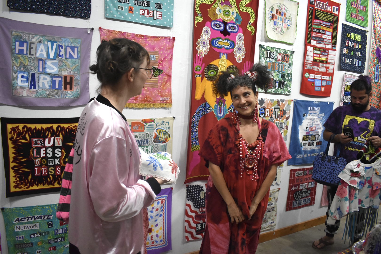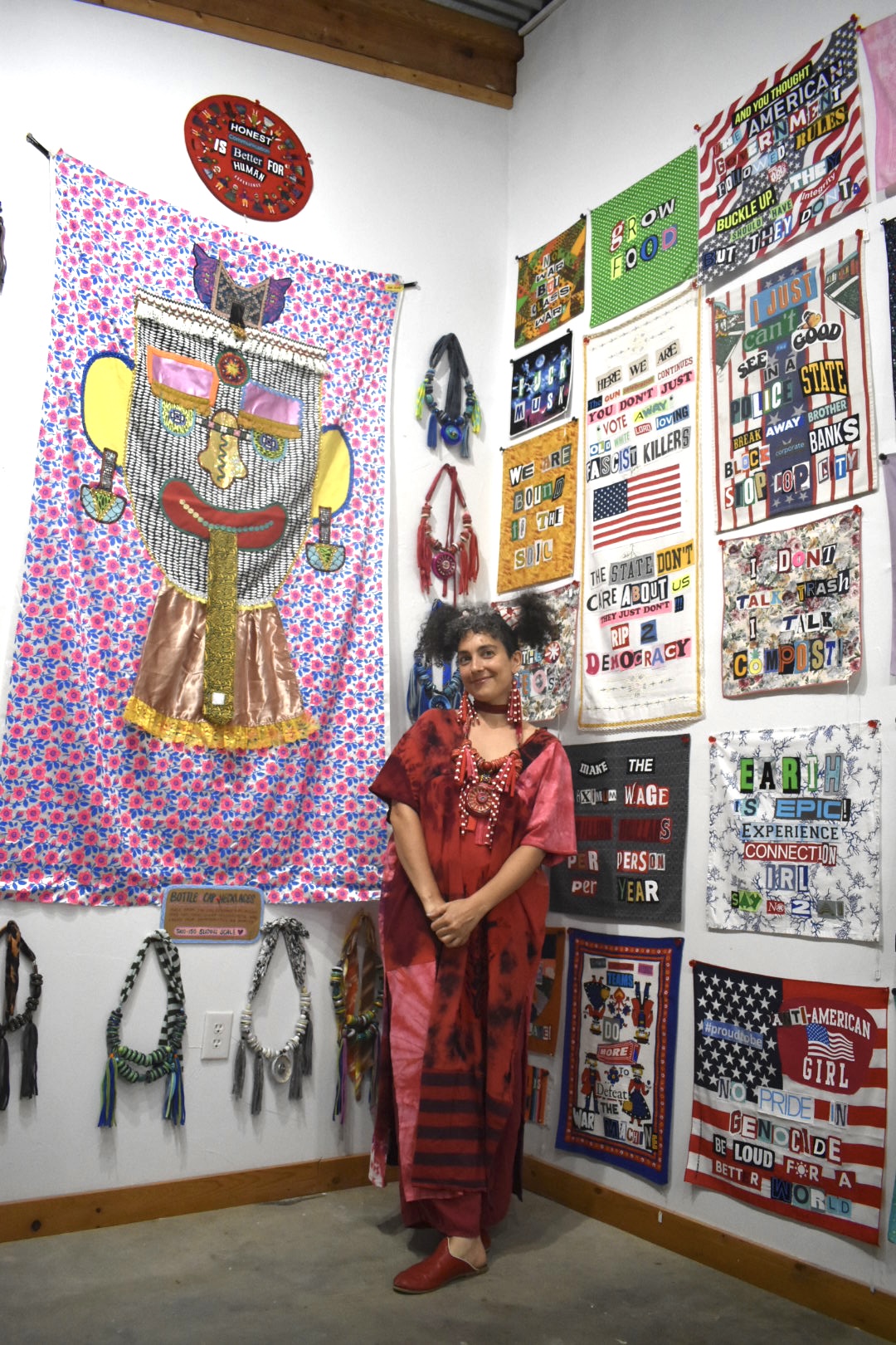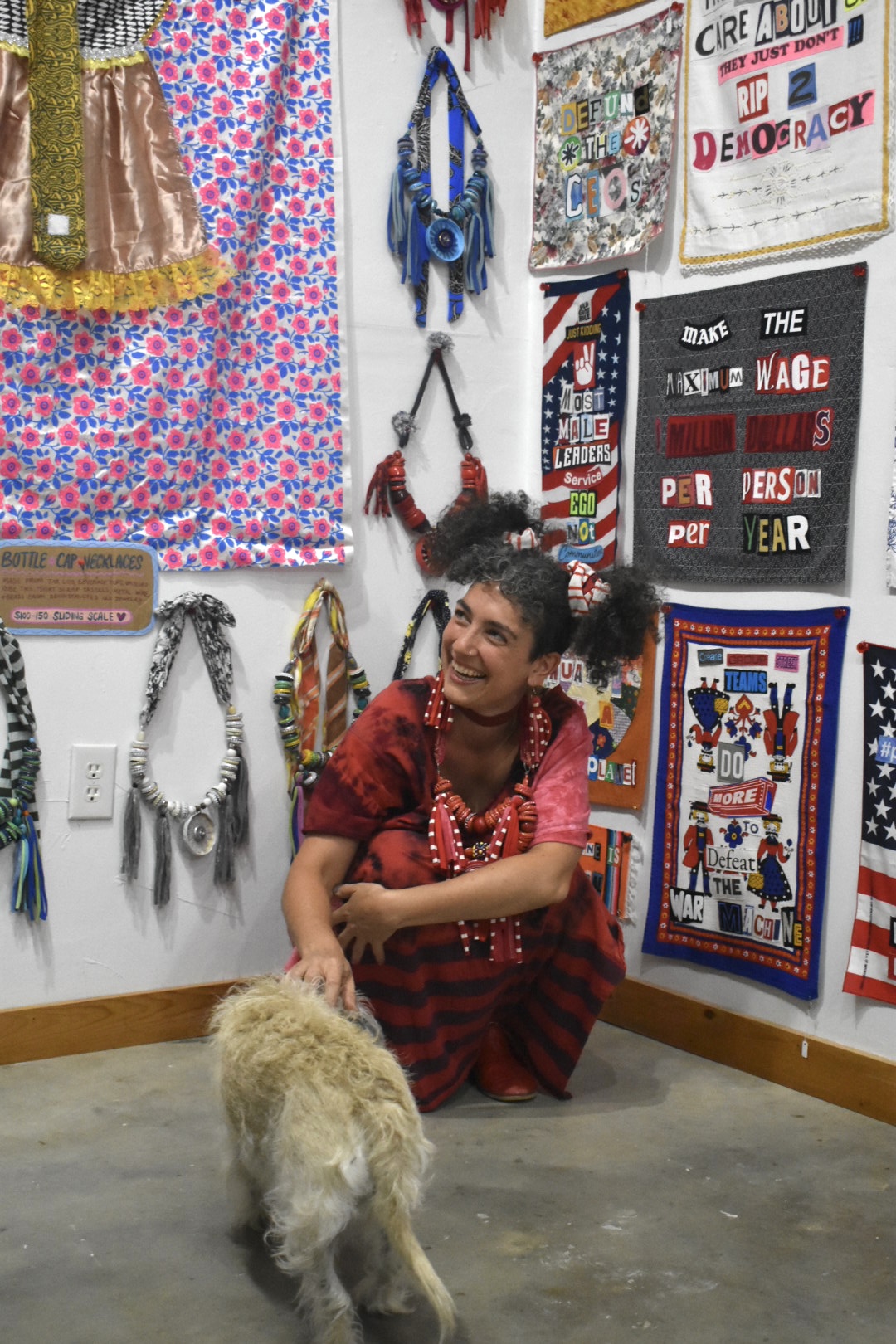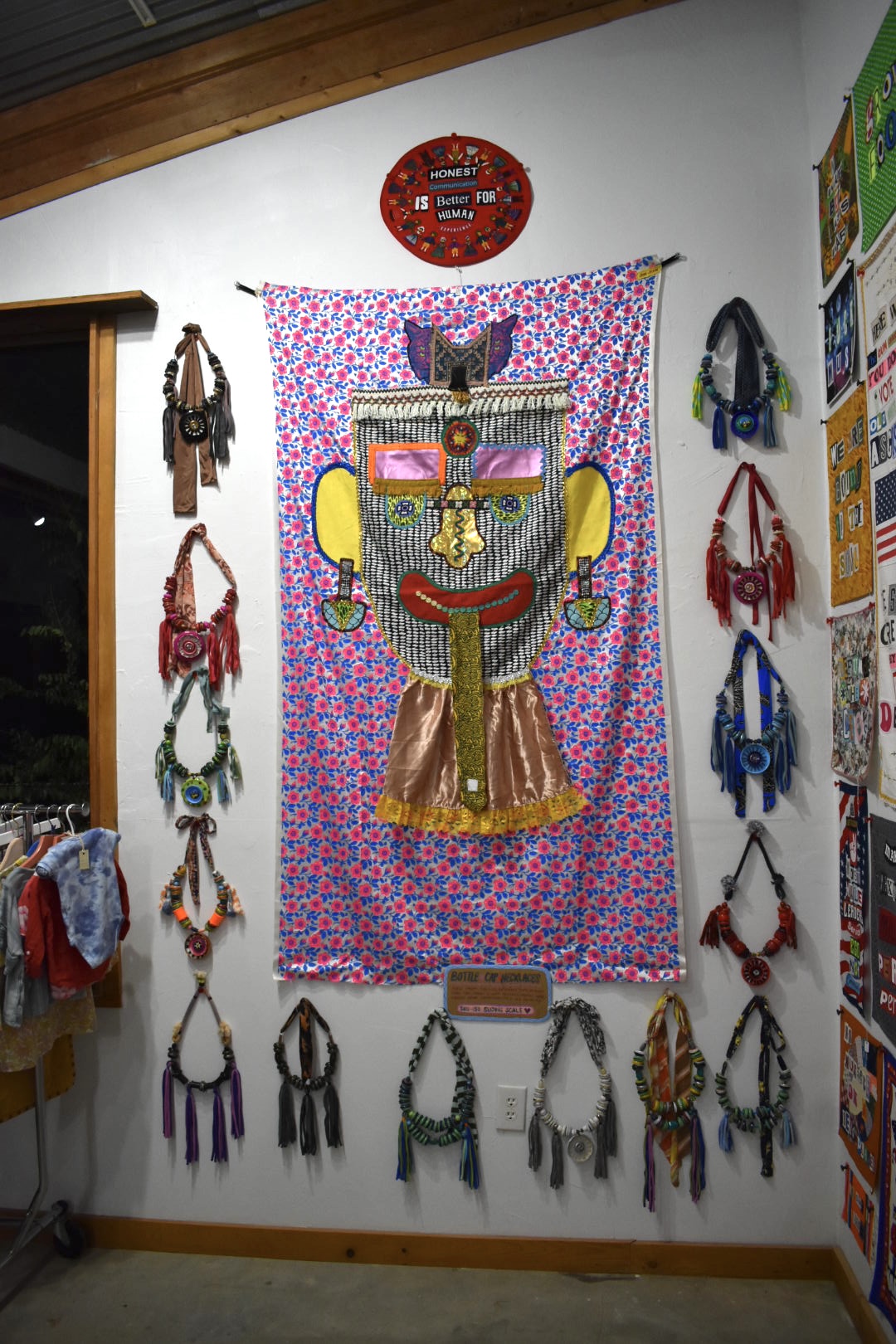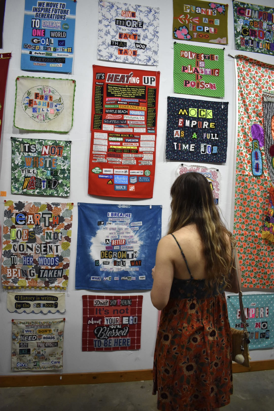 She filled the gallery from floor to ceiling with upcycled tapestries, patches and clothes, most originating from clothing and fabric en route to landfills. She transforms fabric into one-of-a-kind wearable artworks that rebel against the overproduction and overconsumption that is normalized in our day-to-day lives. The show is on view until Oct. 25 with gallery hours from 11:00 a.m. to 4:00 p.m. at 405 Valley View West Road.