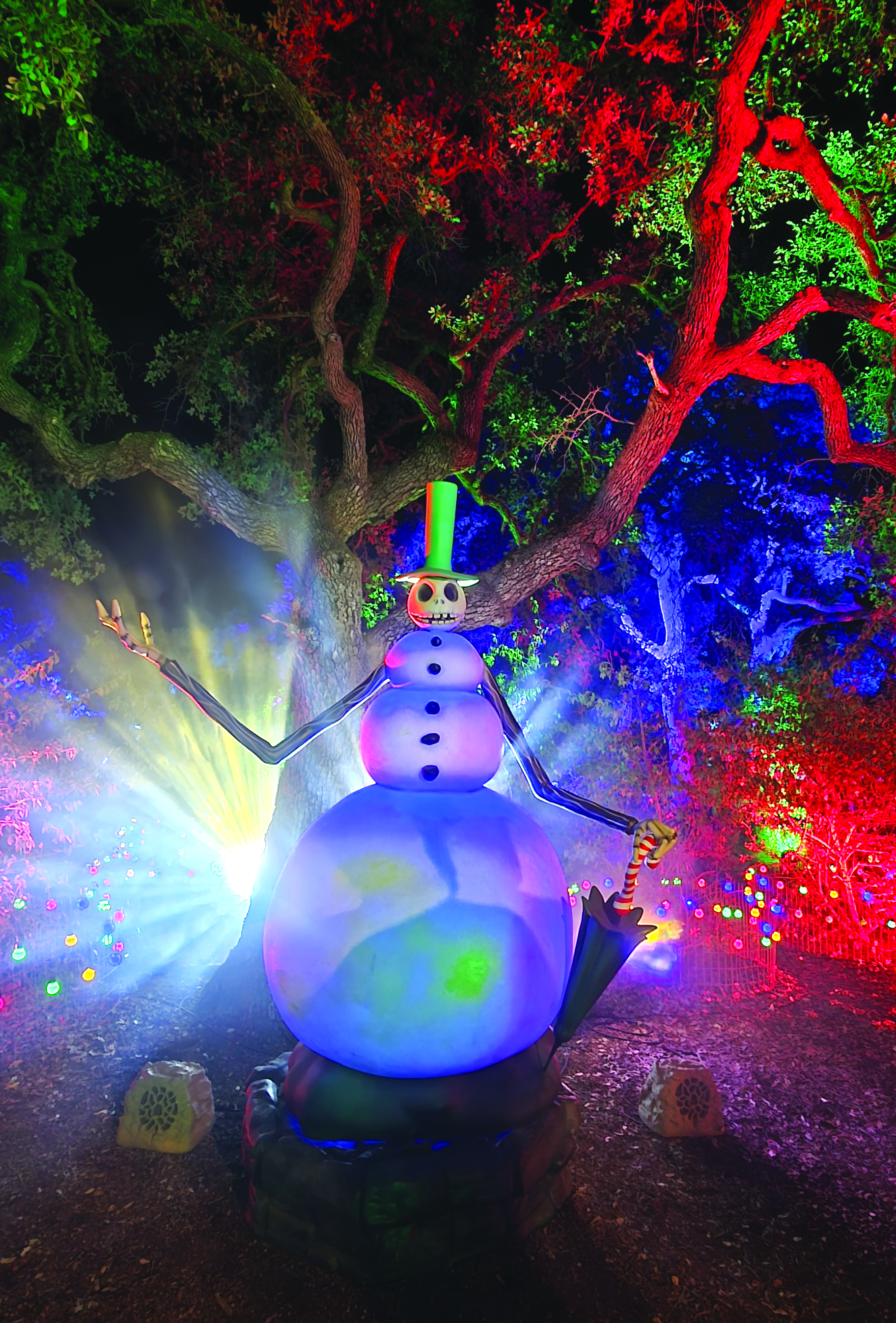 An evening breeze stirs through the trees, carrying the scents of fallen leaves and buttered popcorn across the open field. Then, as the path winds forward, a luminous orange Jack-O-Lantern, big as a house, looms into view. Tendrils of music sift through the evening air, haunting yet familiar, beckoning visitors to the entrance of the Disney Tim Burton’s The Nightmare Before Christmas Light Trail.