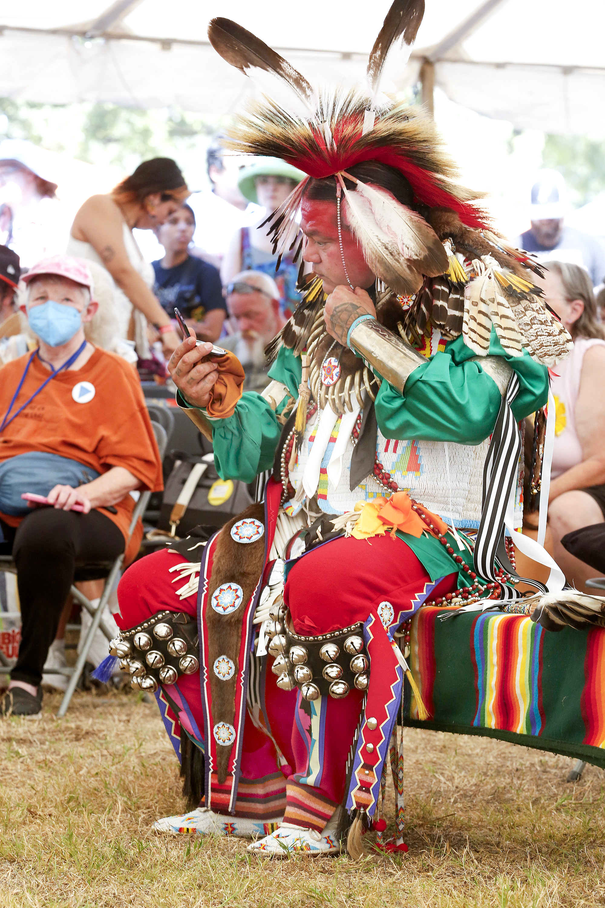 Another result of this high-profile powwow was the high level of drumming, including the Ottertrail Singers, a renowned Southern drum group based in Apache, OK led by singer Al Santos, a former professional wrestler and actor who appeared on the Disney+ show “Echo.” The Northern drum group was the Central Texas-based Eagle Point Singers, led by head singer Chayton Hoskins.