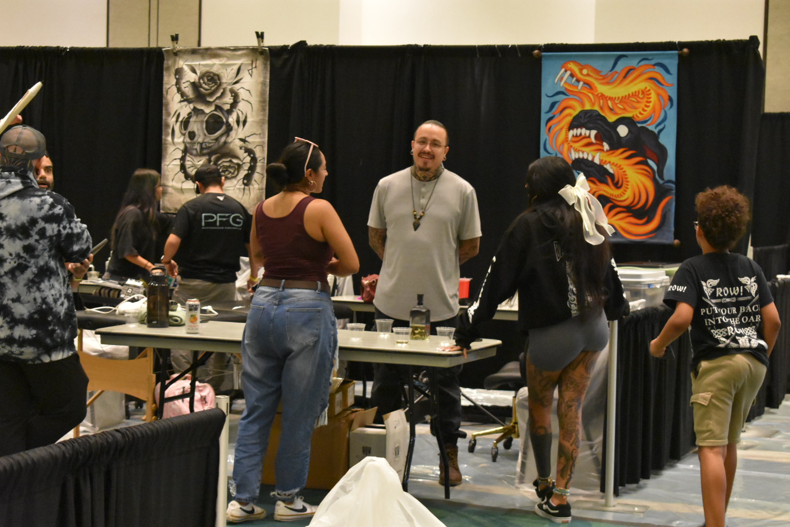 For a whole weekend in September, Texas’s best tattoo artists descended upon San Marcos to showcase their skills and sleeves. The Texas Tattoo Convention travels the state, bringing together local artists and tattoo lovers for a weekend of community. The San Marcos session happened at the San Marcos Conference Center at the Embassy Suites. As guests entered the convention hall a buzzing sound rose from every corner. Dozens of tattoo artists and shops had their own booth, showcasing their artwork on and off the human canvas. Not only did they display their work but they were actively making new creations. Almost every booth had guests laid out, pushing through minor pain to receive permanent art.