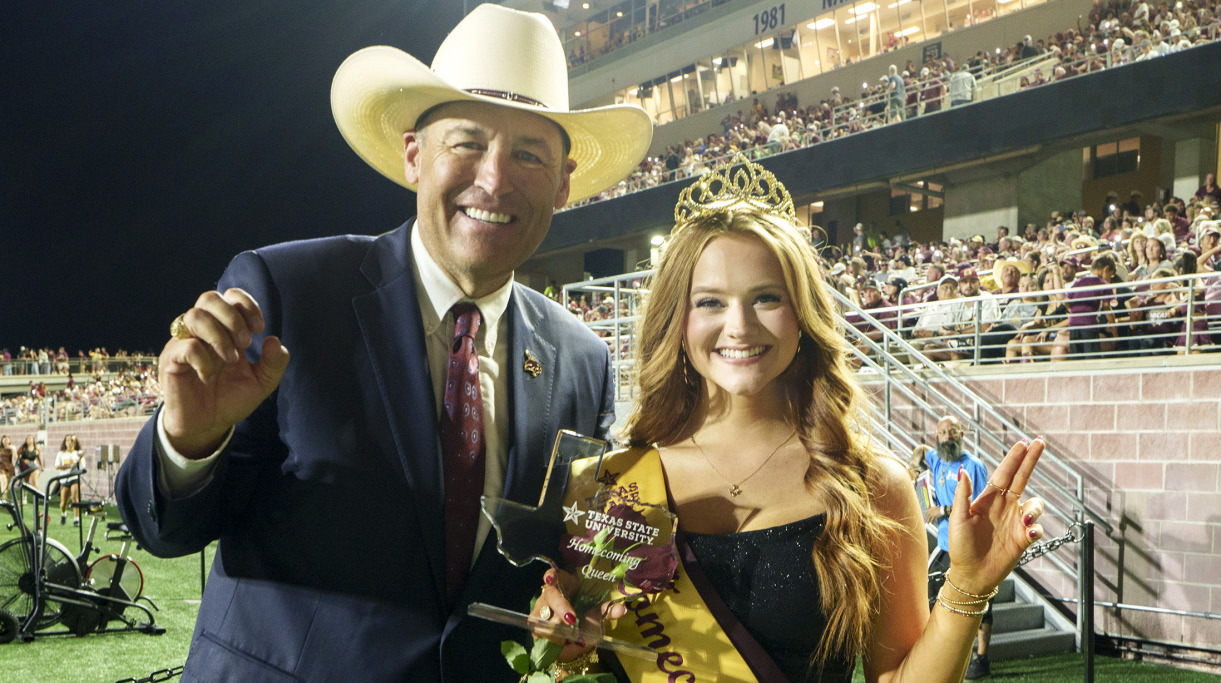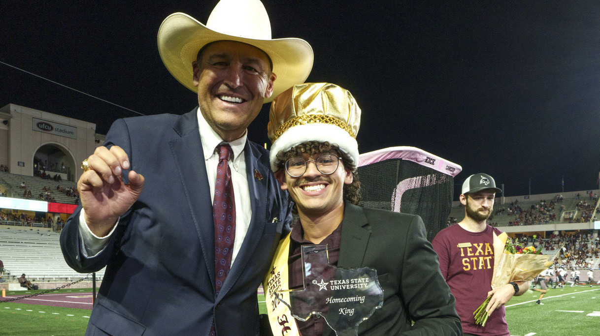 Texas State University President Kelly Damphousse crowned Ellee Carlisle as Homecoming Queen and Joaquin Marquez as the Homecoming King during halftime of the Saturday night football game between Troy and Texas State at UFCU Stadium. Carlisle is a senior majoring in elementary education ESL. She is the Executive Risk Management Chair for Delta Zeta. Marquez is a senior majoring in animal science (pre-vet) and president of the Hellcats spirit fraternity.