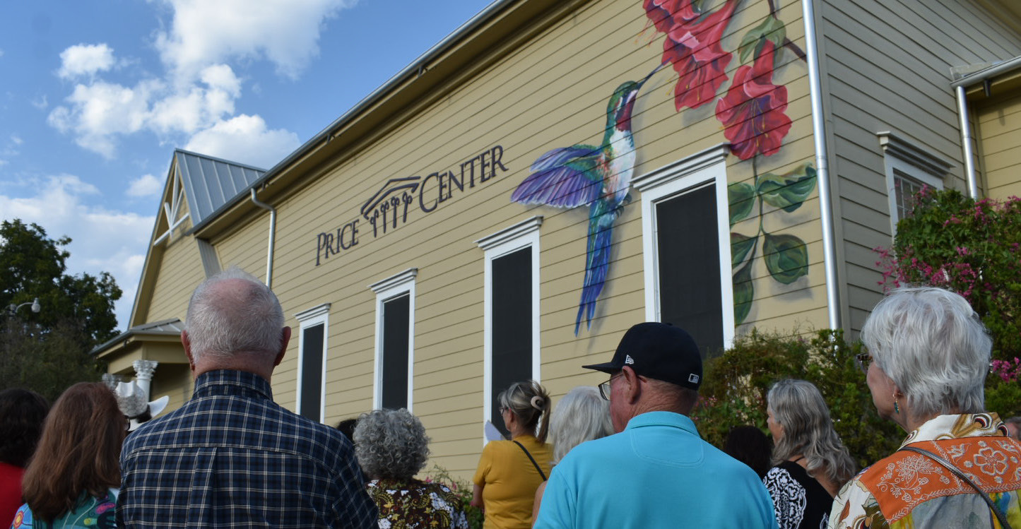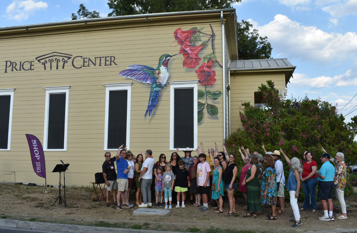 West San Antonio Street has been blooming with new artwork over the past few years. Earlier this month, the Price Center celebrated their newest addition to their public art collection with the unveiling of a curious hummingbird exploring a red flower perched on the corner of the building facing the W. San Antonio and Comanche St. crossroads, creating a friendly face for those entering Downtown. Below, the mural is framed by the real life flowers speckled throughout the Price Center’s gardens.