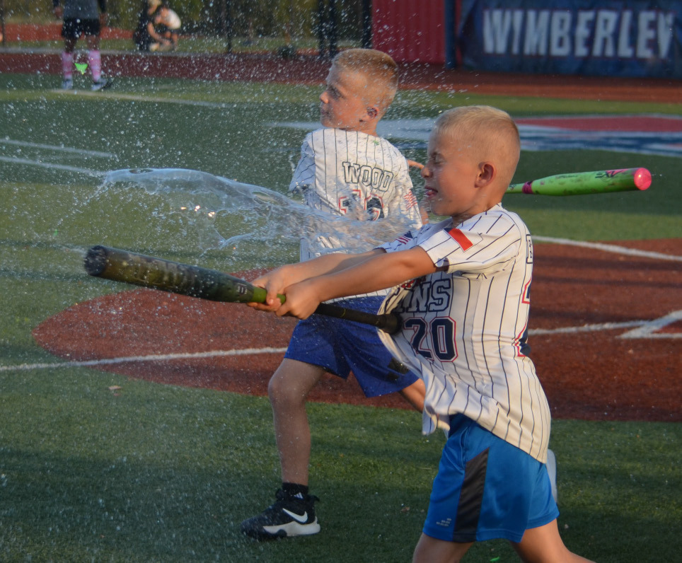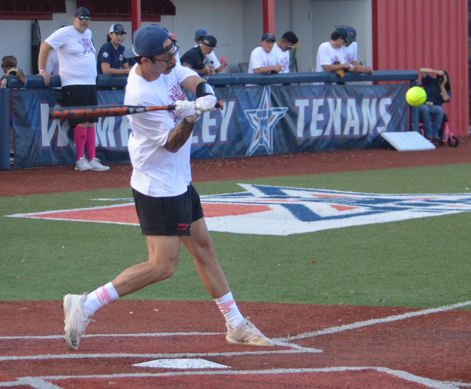 The event drew a crowd to the Wimberley ISD Baseball/Softball Complex, where spectators enjoyed kettle corn, cotton candy, hot dogs, raffles and plenty of laughs as the two teams battled it out. There were Wimberley Texan cheerleaders, a dizzy bat race, a water balloon batting contest and a firefighter geardonning competition as well.