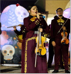 Día de los Muertos is the Mexican celebration of All Souls Day. Family members build ofrendas, typically with photos of deceased loved ones. They include loved one’s favorite food and drinks and candles to light the way. They remember them with stories and by looking at photos or videos. Paper banners, marigolds and painted skulls, or caleveras are some of the traditional decorations. Local performers Chicas Caleveras appeared dressed as Catrin y Catrina, the skeletal symbols of Dia de los Muertos.