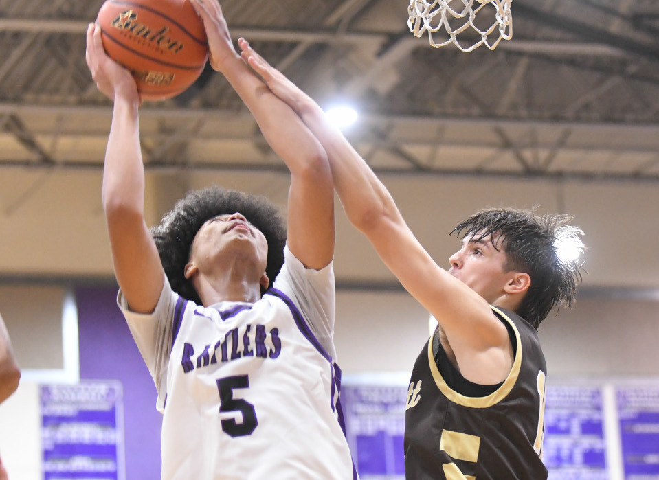 Freshman Tytan Crayton goes up for the basket in the Rattlers win against Austin Crockett. Crayton was third in scoring with eight points. Daily Record photo by Gerald Castillo
