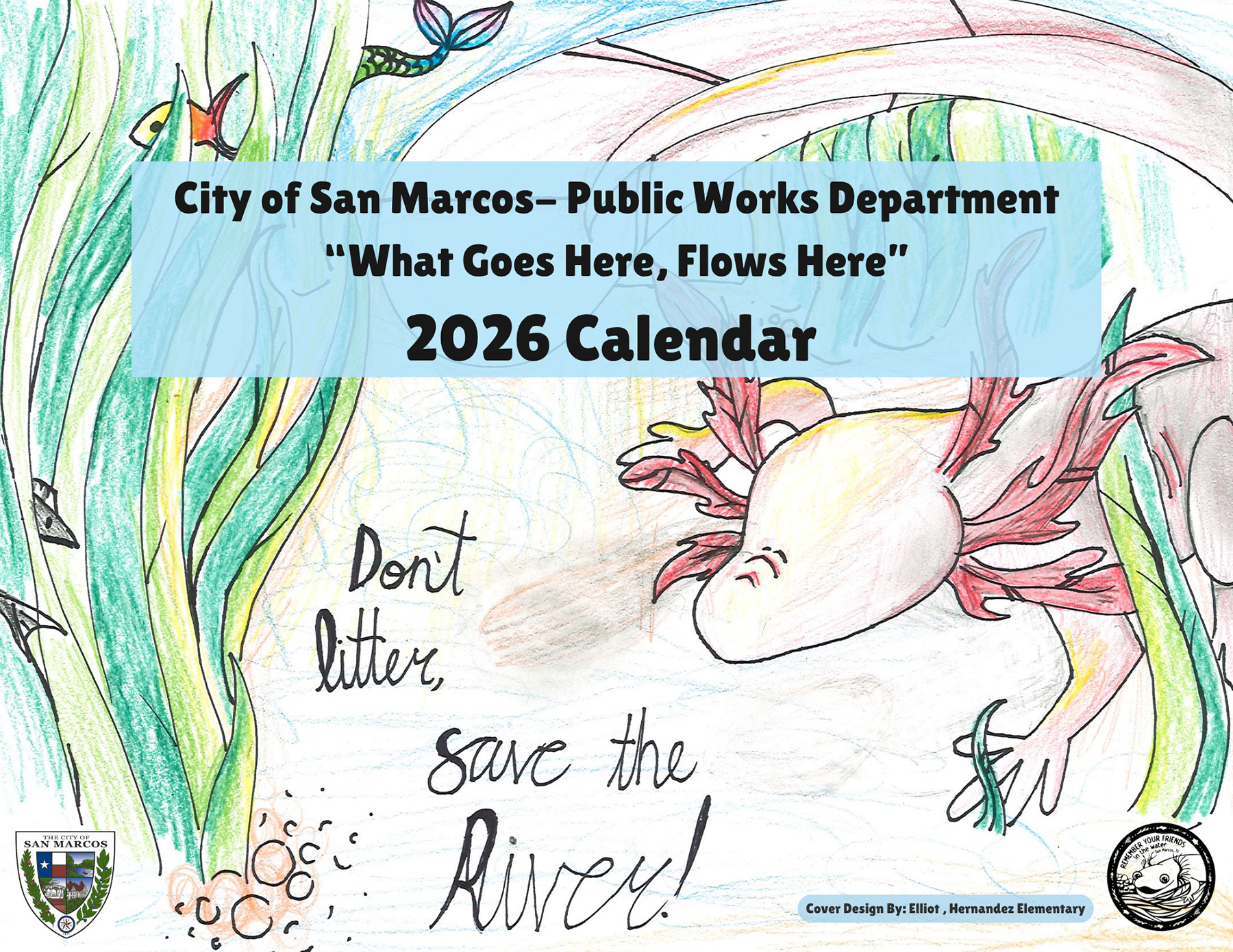 Here are the names and school of each of the winners: The cover was designed by Elliot, Hernandez Elementary January: Judah, Homeschool February: Leeum, DeZavala Elementary March: Ruby, Hernandez Elementary April: Athena, Hernandez Elementary May: Aryanna, Walnut Springs Elementary June: Hadassah, Homeschool July: Bailey, Hernandez Elementary August: Willa, Valor Elementary September: Keyli, Hernandez Elementary October: Emelyn, San Marcos Baptist Academy November: Naomi, Dripping Springs Elementary December: Elena, Hernandez Elementary Runner-up: Mallory, Hernandez Elementary Runner-up: Chloe, Hernandez Elementary Runner-up: Grayson, Wonderland Academy The 2026 Stormwater Calendars are available free of charge at the San Marcos Public Library, 625 E. Hopkins, and the San Marcos Activity Center, 501 E. Hopkins, while supplies last. A digital version is also available for download at sanmarcostx.gov/calendarcontest.
