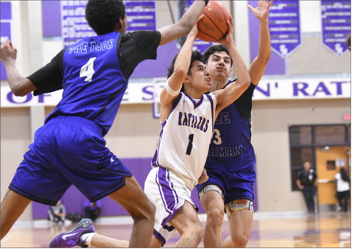 Senior Jordan Bernal fights to protect the ball from the Lehman defenders in the Rattlers win over the Lobos. Daily Record photo by Gerald Castillo