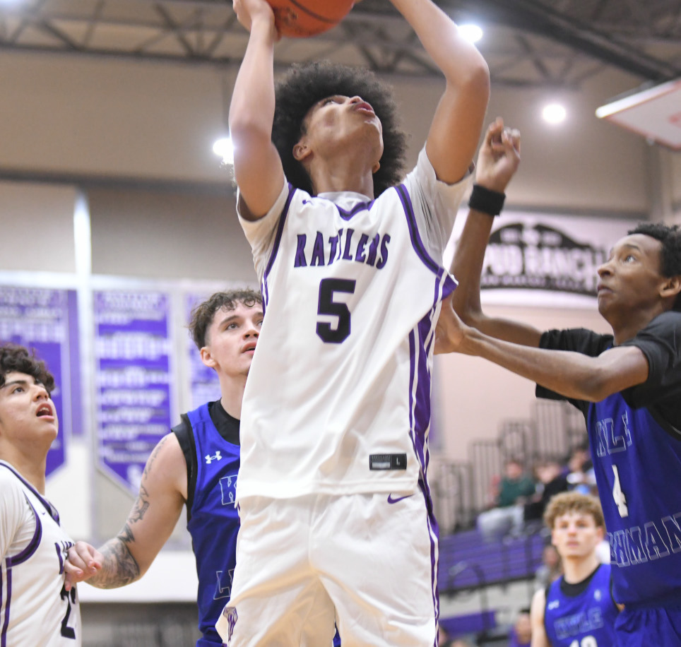 Sophomore Cameron Bundage hits the layup through the Lehman defenders in the Rattlers win over Lehman. Daily Record photo by Gerald Castillo