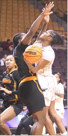 Sophomore Saniya Burks goes up for the tough shot in the Bobcats conference game against Louisiana Monroe. Burks was second in scoring with 22 points. Daily Record photo by Gerald Castillo