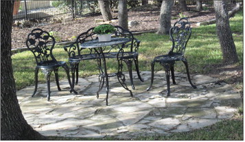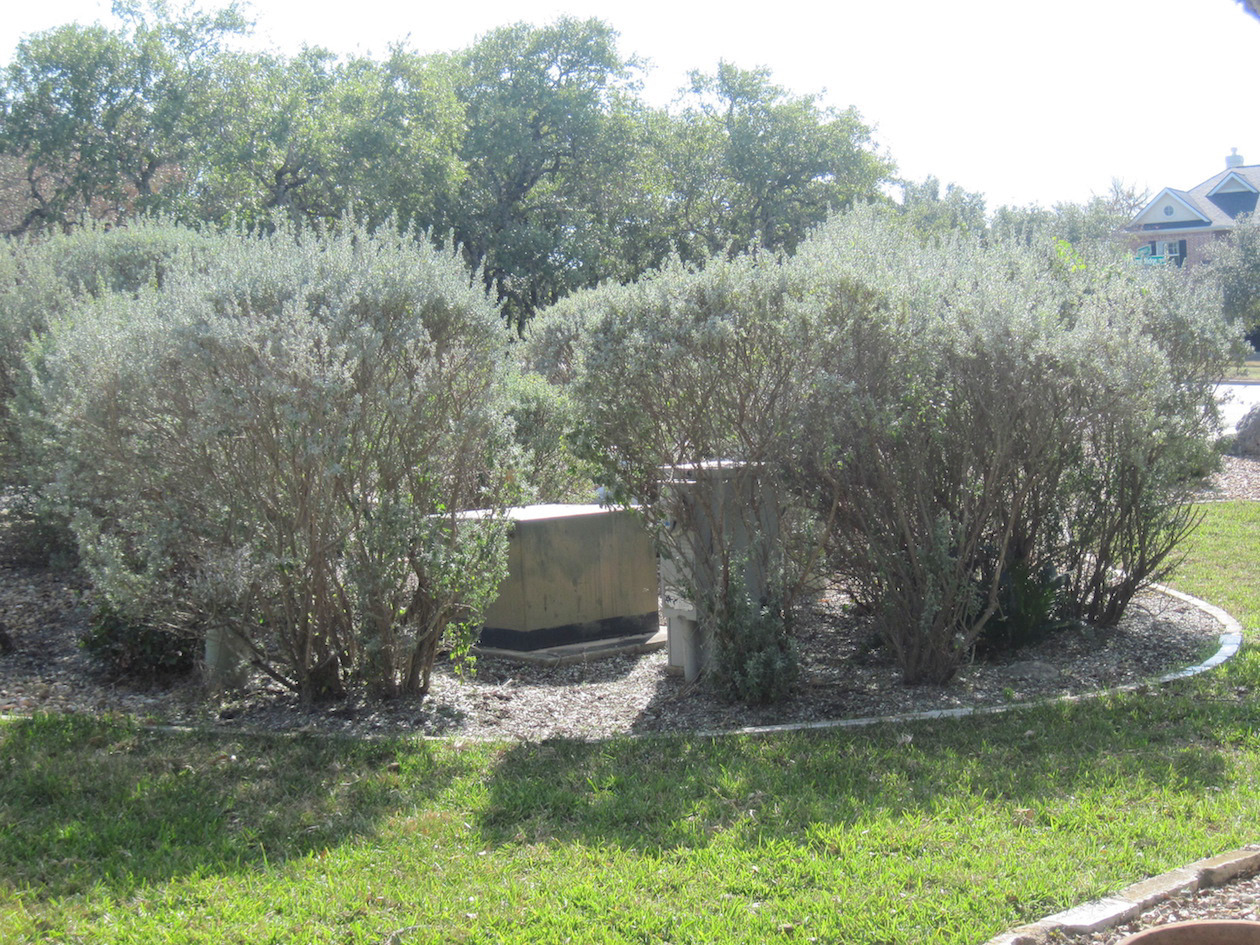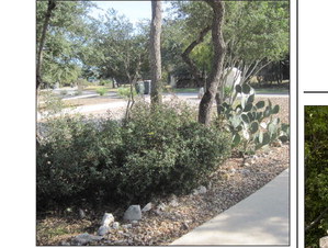 A circular flagstone patio in the front yard has become an outdoor “room” since the Teasleys added a weather-resistant and decorative metal table and seating in the shade of the oaks. The view from this area is improved by Texas sage or cenizo encircling utility units near the street; purple sage blooms provide an attractive screen to bare metal boxes. Other views from the seating area or the entry include decorative grasses and native plants in a mulched bed near the house, and the spiky green leaves of agarita and prickly pear cactus growing in rock mulch beside the driveway.