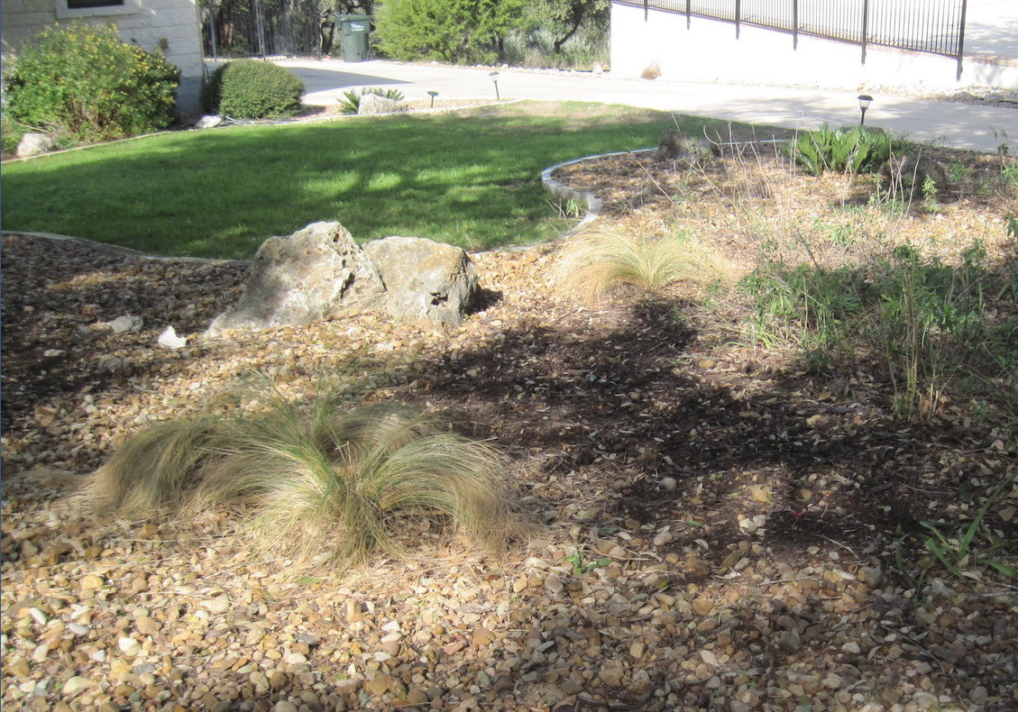 Although the Teasleys have lived here just over a year, their careful stewardship of a sustainable landscape is evident, and will continue in future amendments. Bonita Teasley explains their primary challenge has been “maintaining the property while ensuring landscaping is deer-friendly,” which means relying on native plants that have evolved to coexist with wildlife. Her description of this balance as “deer friendly” rather than “deer resistant” is a refreshing new viewpoint on landscaping in Central Texas. New sod added last spring had to be protected from deer browsing but thrived once established, and decorative grasses are not on the menu for deer.