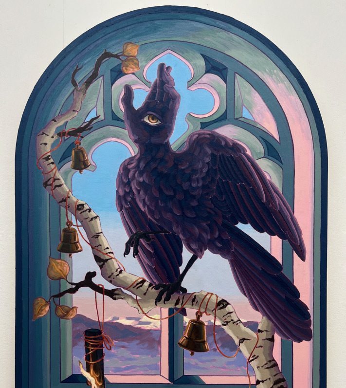 Her paintings at Jo’s share a common theme, many depicting birds or parts of birds. In a few of the pieces she has threaded red string through the canvas to add an elevated texture, both physically and metaphorically. Rich symbolism flows from work to work, depictions of bells and even blood give surrealistic context to the rich purple and blue hues used in the paintings. Her work is based on her personal experience with her own emotions and feelings.