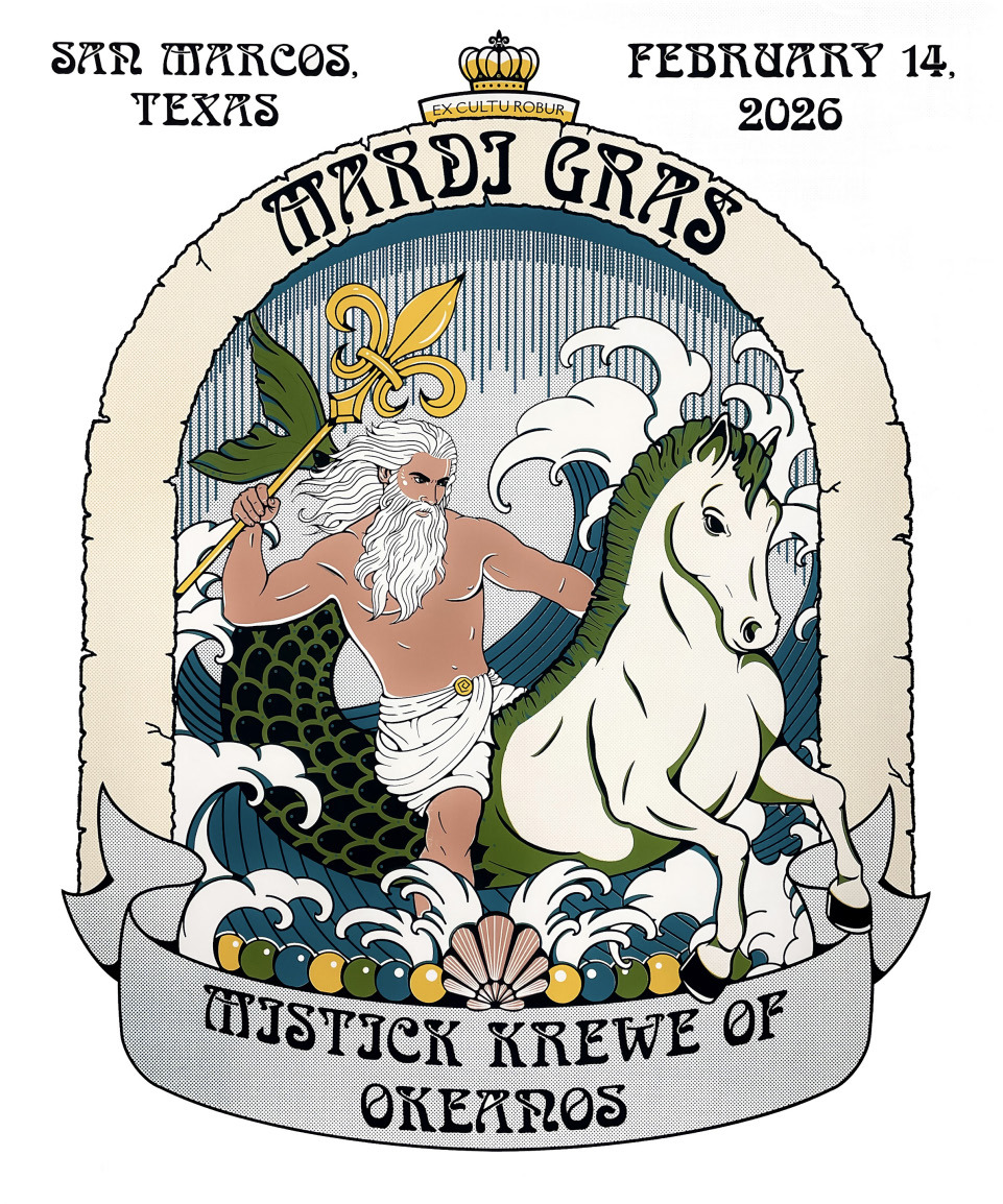 The Krewe of Okeanos, San Marcos’ original Mardi Gras Krewe, is proud to announce Sarah Swinford as the Krewe’s 2026 official Mardi Gras poster artist. The poster promotes the Krewe’s annual Mardi Gras parade which will be held on Saturday, Feb. 14.