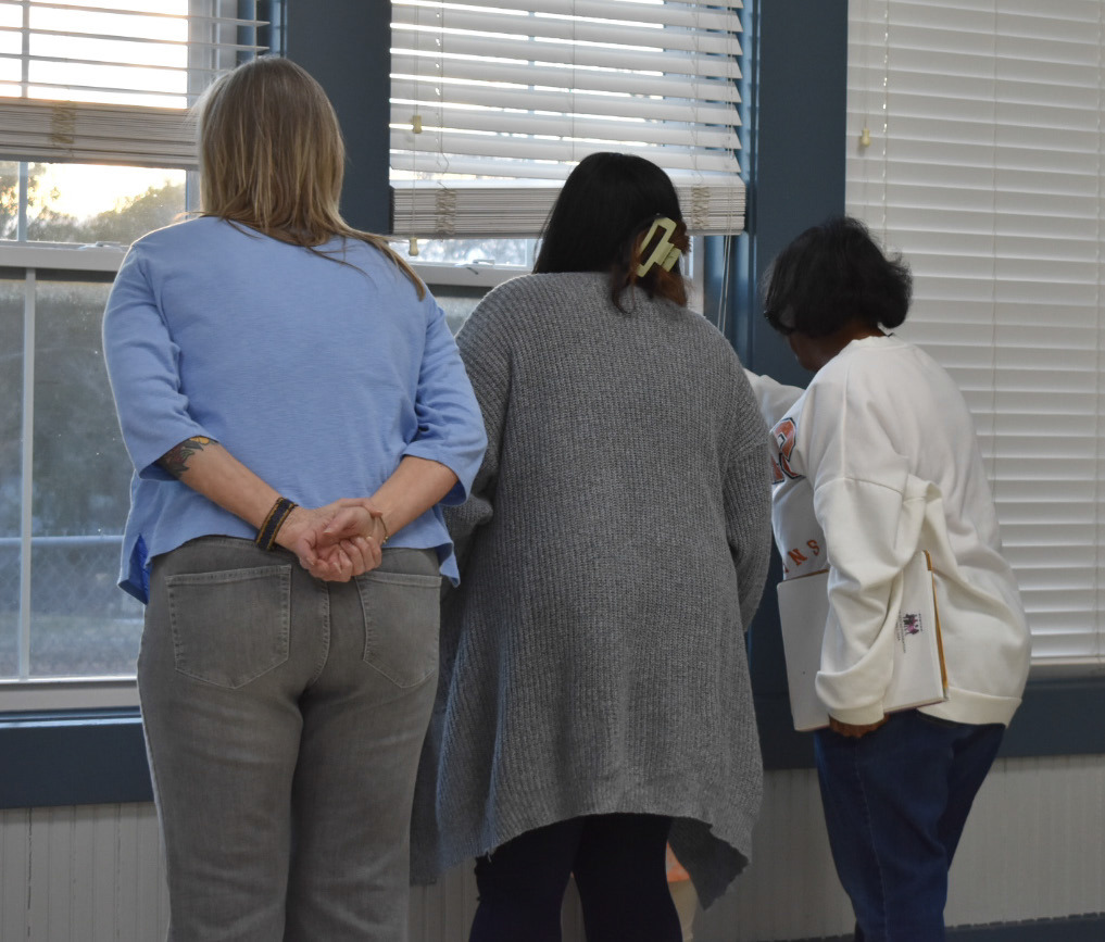 Charlotte and fellow citizens peer out the windows of the Dunbar Community Center to get a view of possible installation locations around the walking path. Photo courtesy of Rebekah Porter