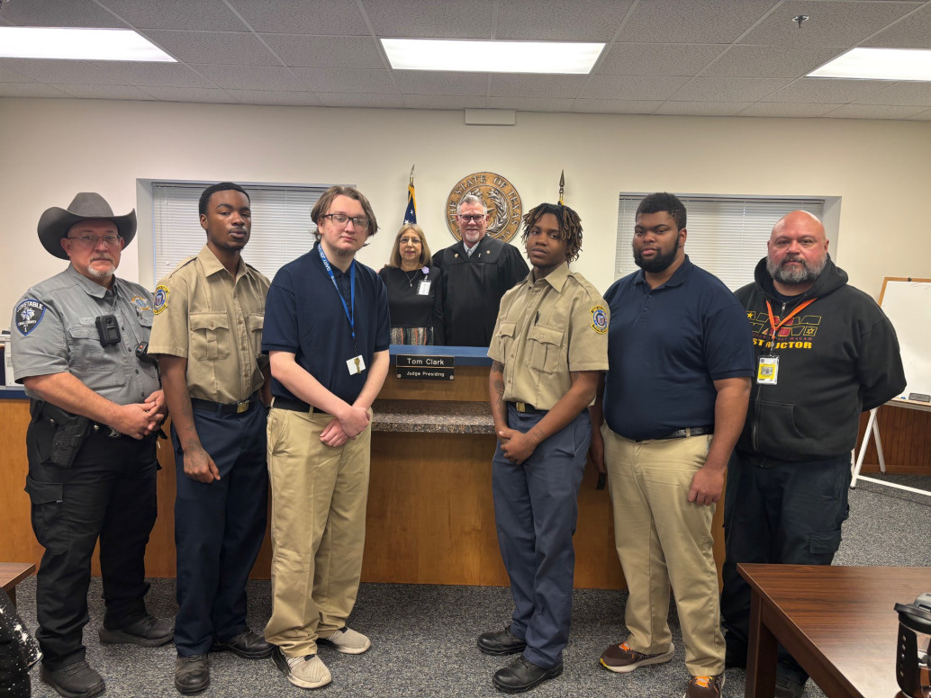 Pictured at Comal County Justice of the Peace Office Pct. 1: Judge Tom Clark, Court Coordinator Sylvia Haegele, Comal Deputy Constable and Daniel Weaver. Also pictured: Gary Job Corps students Darmarius Lee, Tahj Hughes, Skylar Faux, Mehki Smith and GJC Instructor Jose Montes. Photo courtesy Randolph Goodman