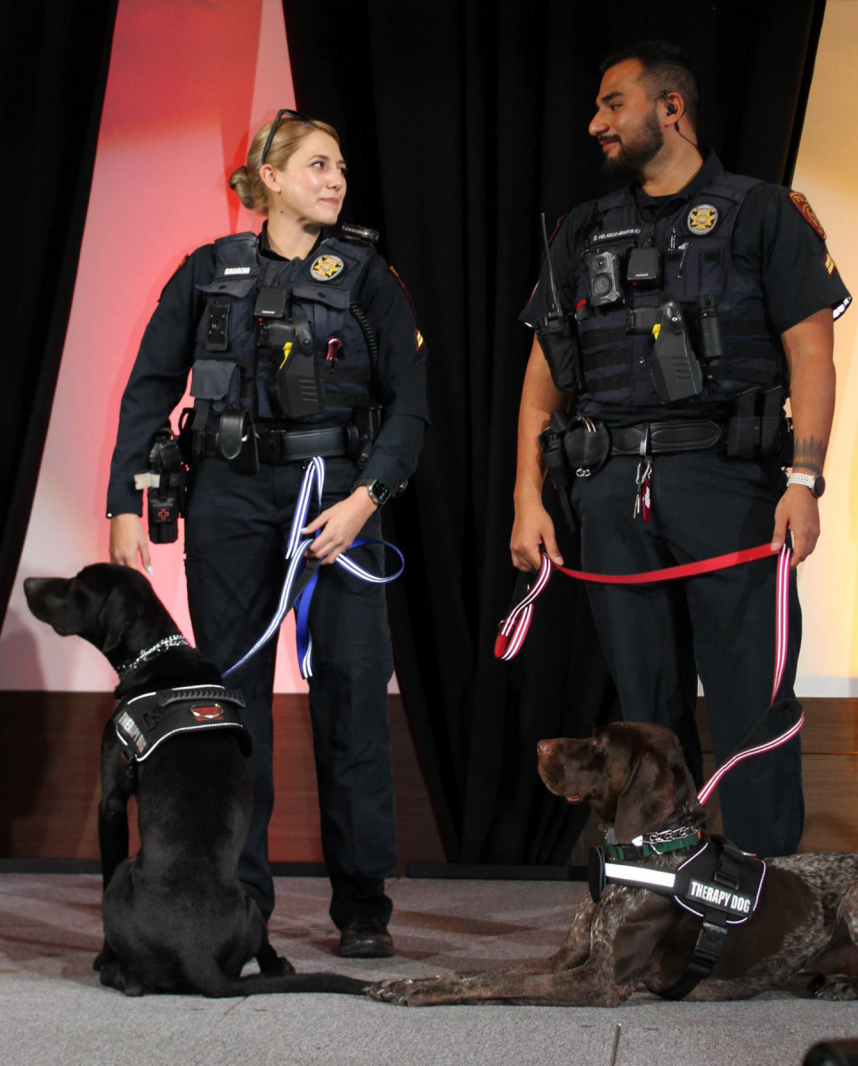 Following through on its commitment to expand the “Compassion-Based Policing” model, the Texas State University Police Department (UPD) has sworn in two new certified therapy K9s: Pawfficer Mando and Pawfficer Baloo.