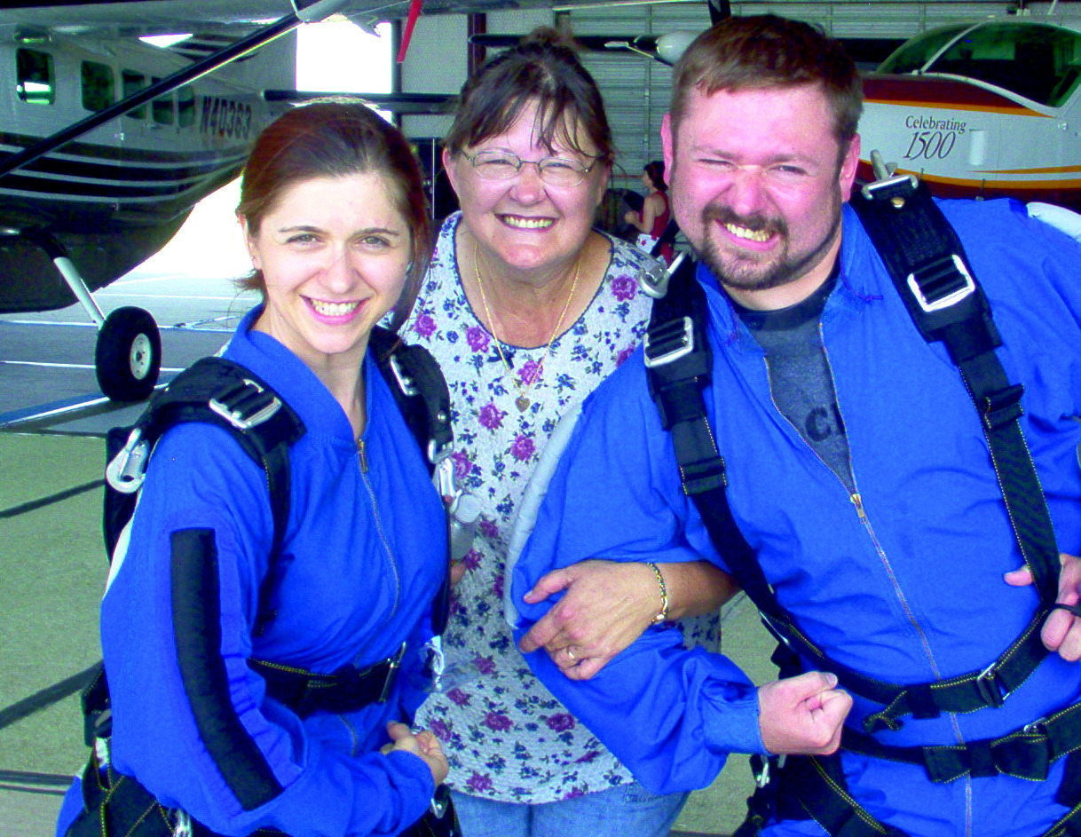 Never one to shy away from adventure, Pam set the example early for her family. She is pictured here with her skydiving children Celeste and Chris.
