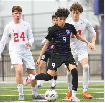 Grayson Sanchez keeps the ball away from Canyon defenders during the Rattlers final home game against the Cougars. Sanchez scored the lone goal for the Rattlers. Daily Record photo by Gerald Castillo