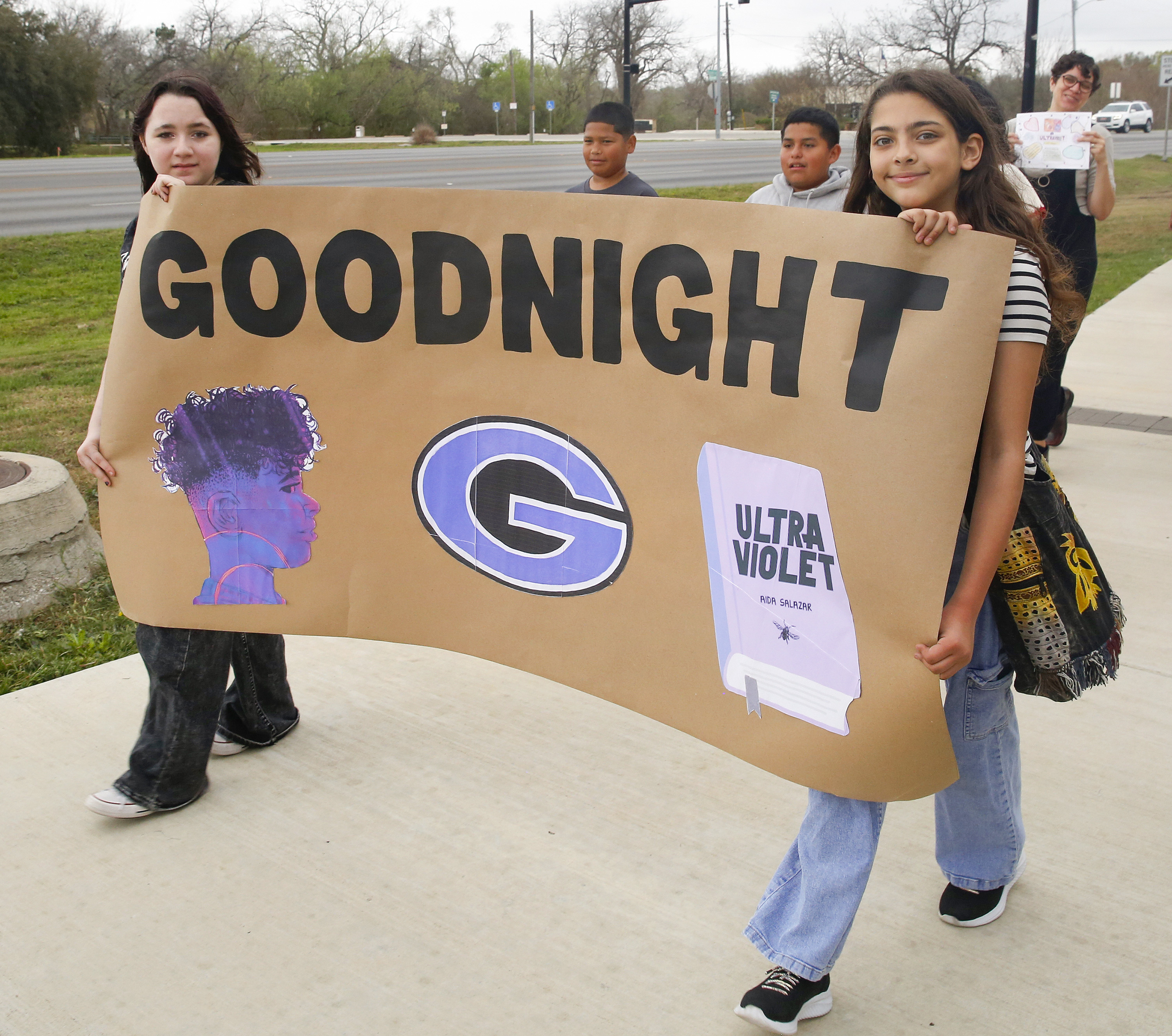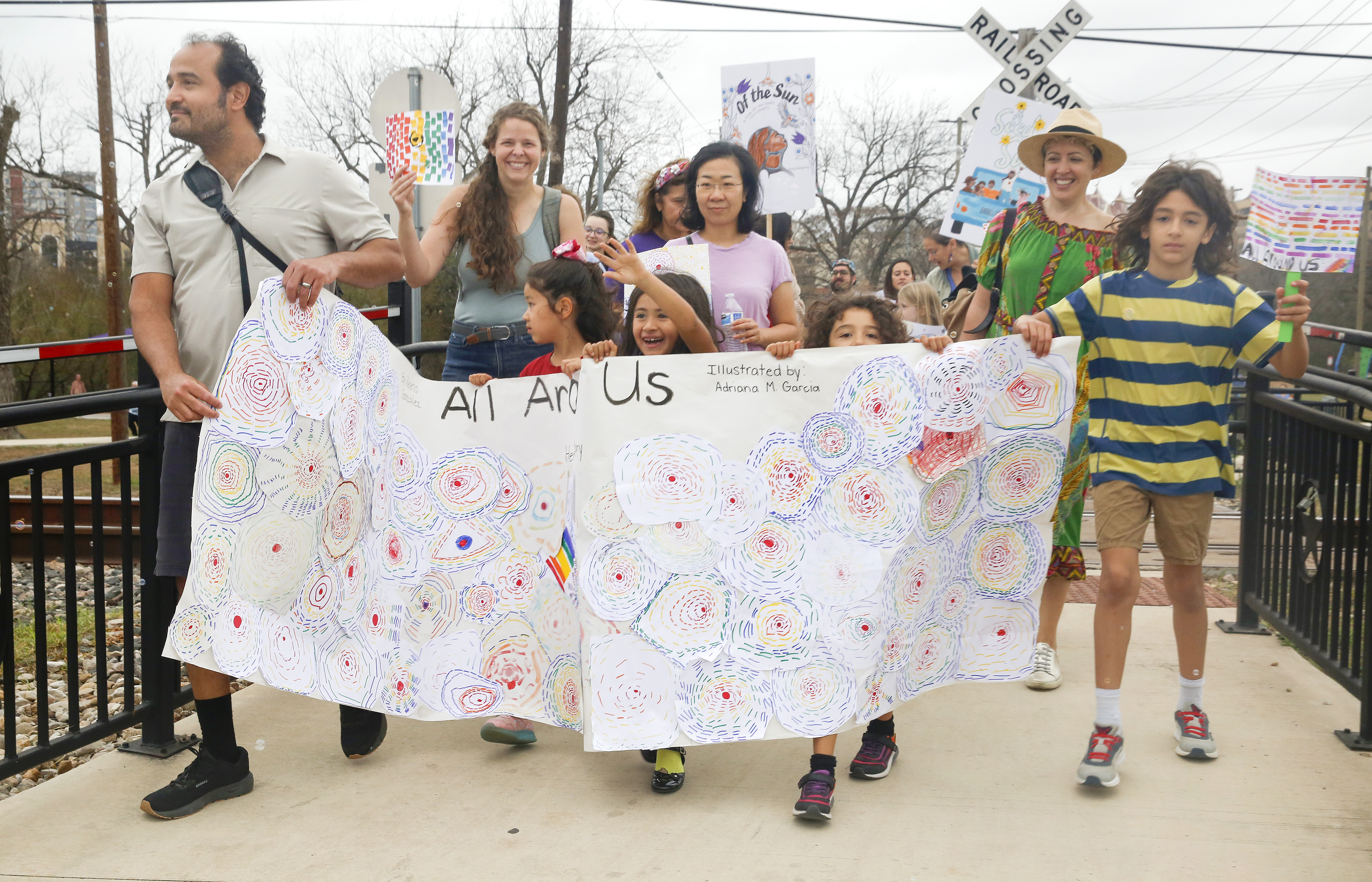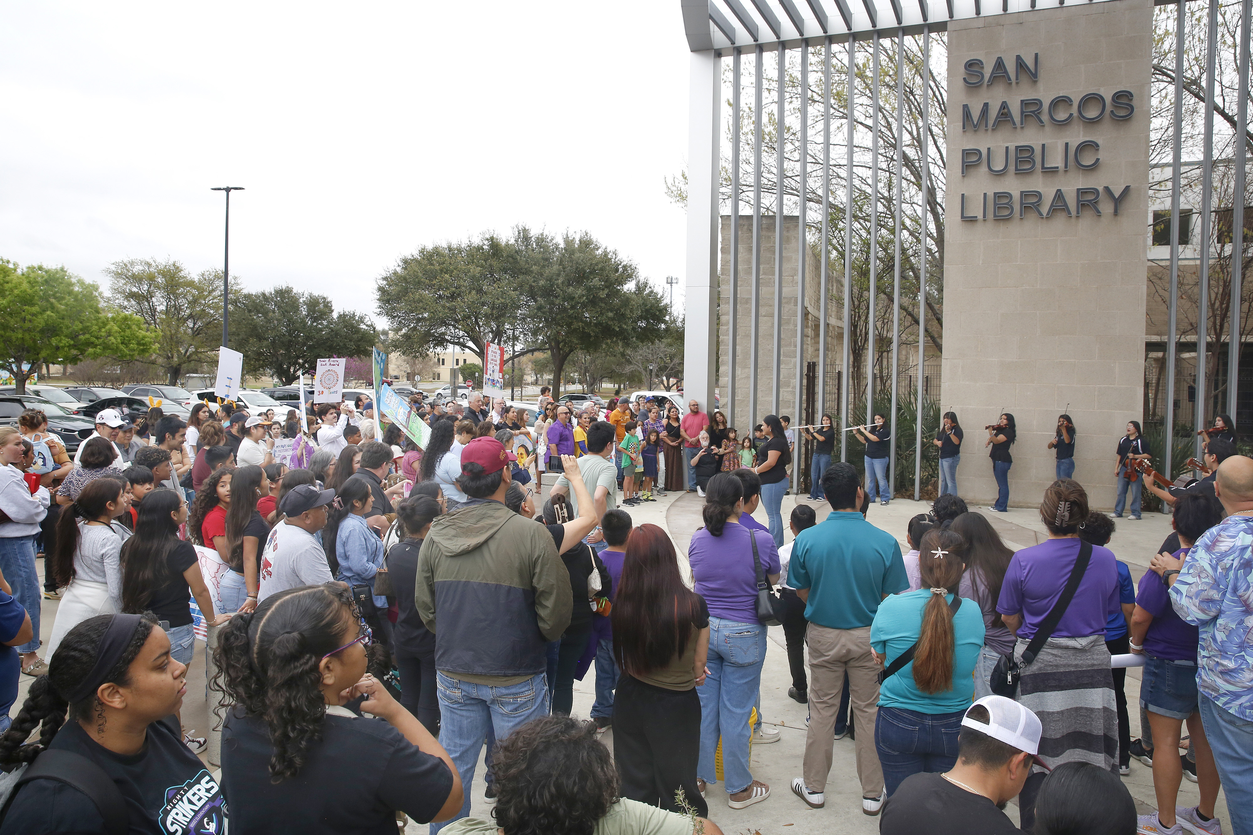 The event began at City Park, where authors holding signs to promote their books joined with area students and teachers for a festive parade to the San Marcos library, where participants were greeted by a performance from the San Marcos High School Mariachi band, followed by welcome remarks.