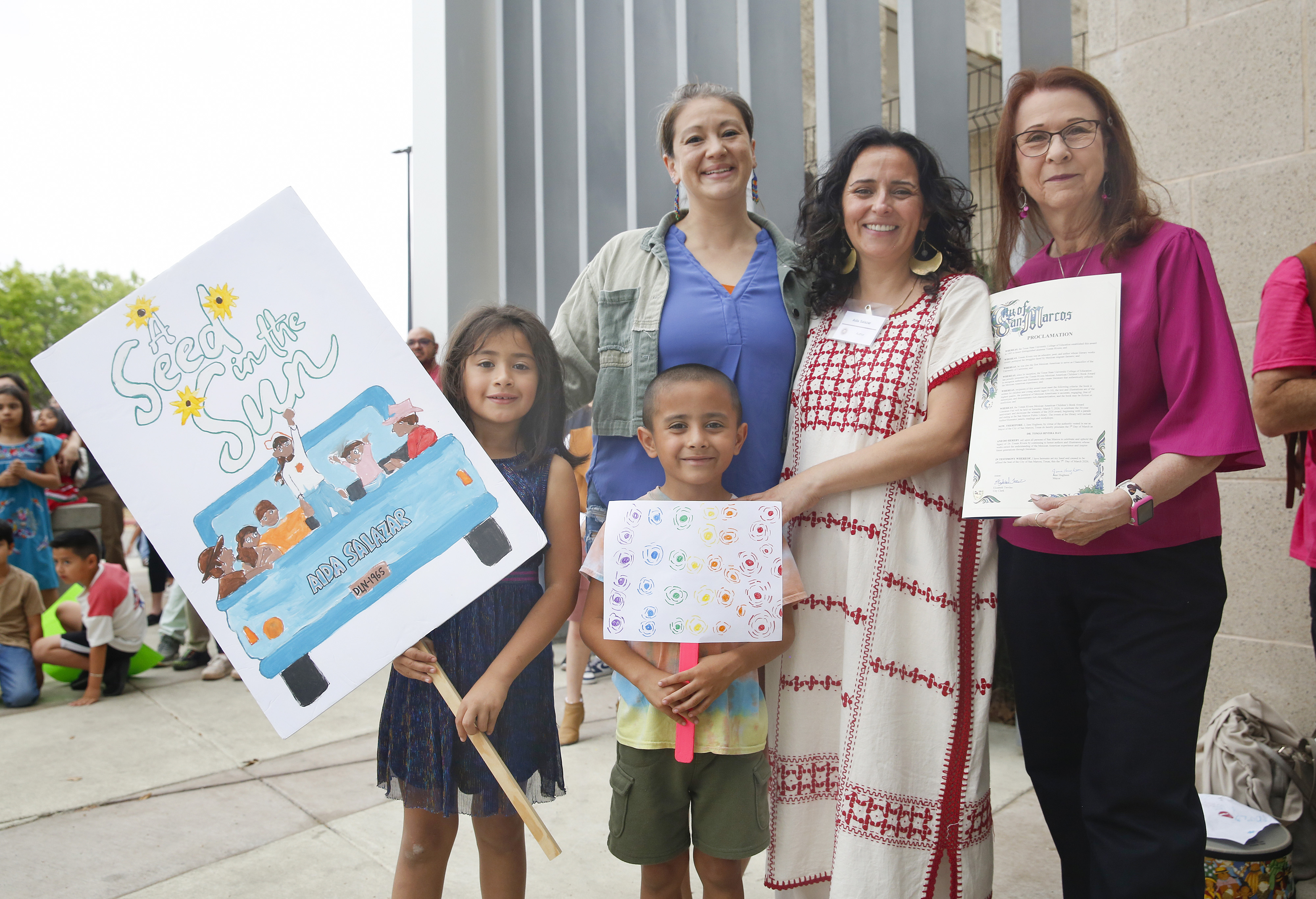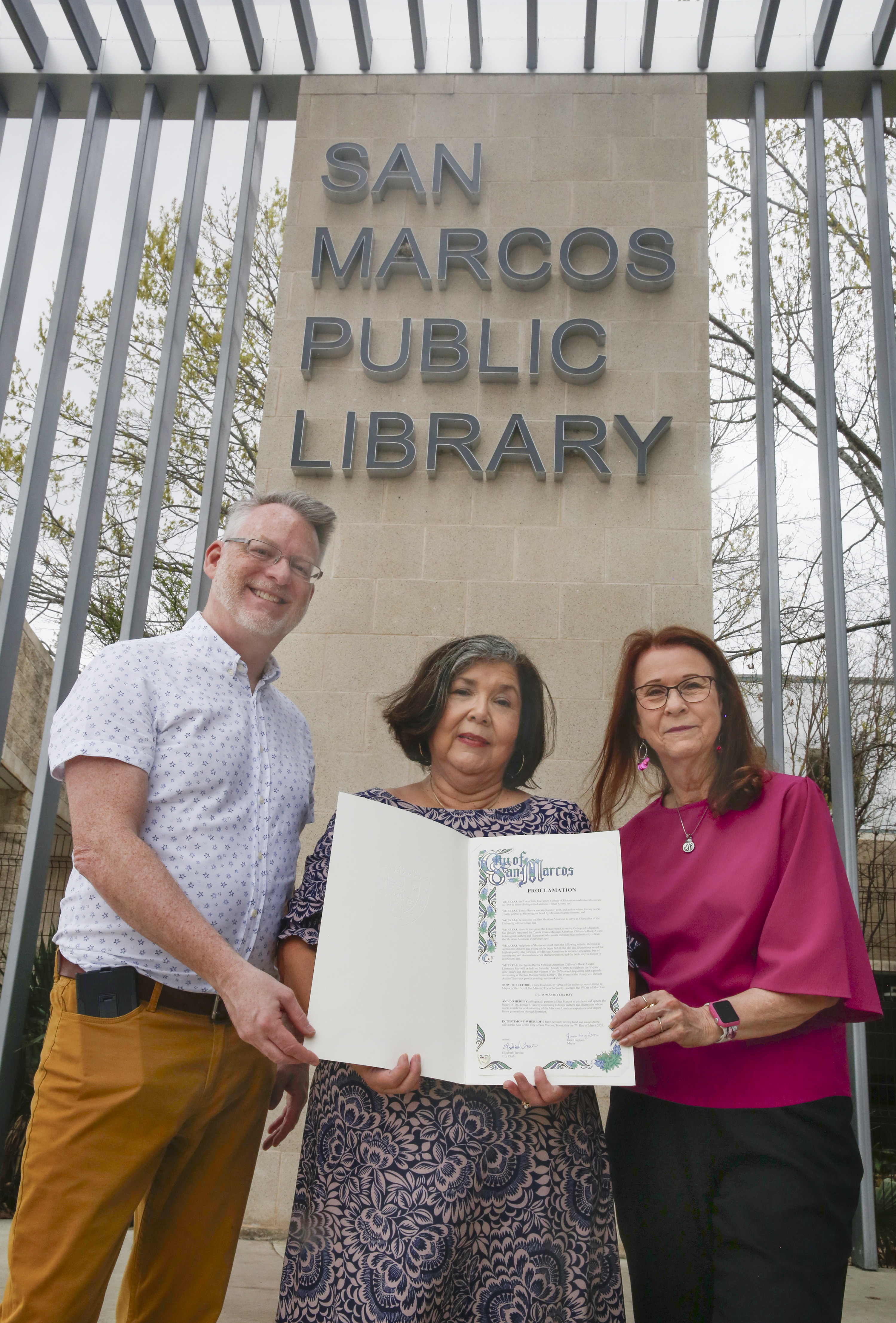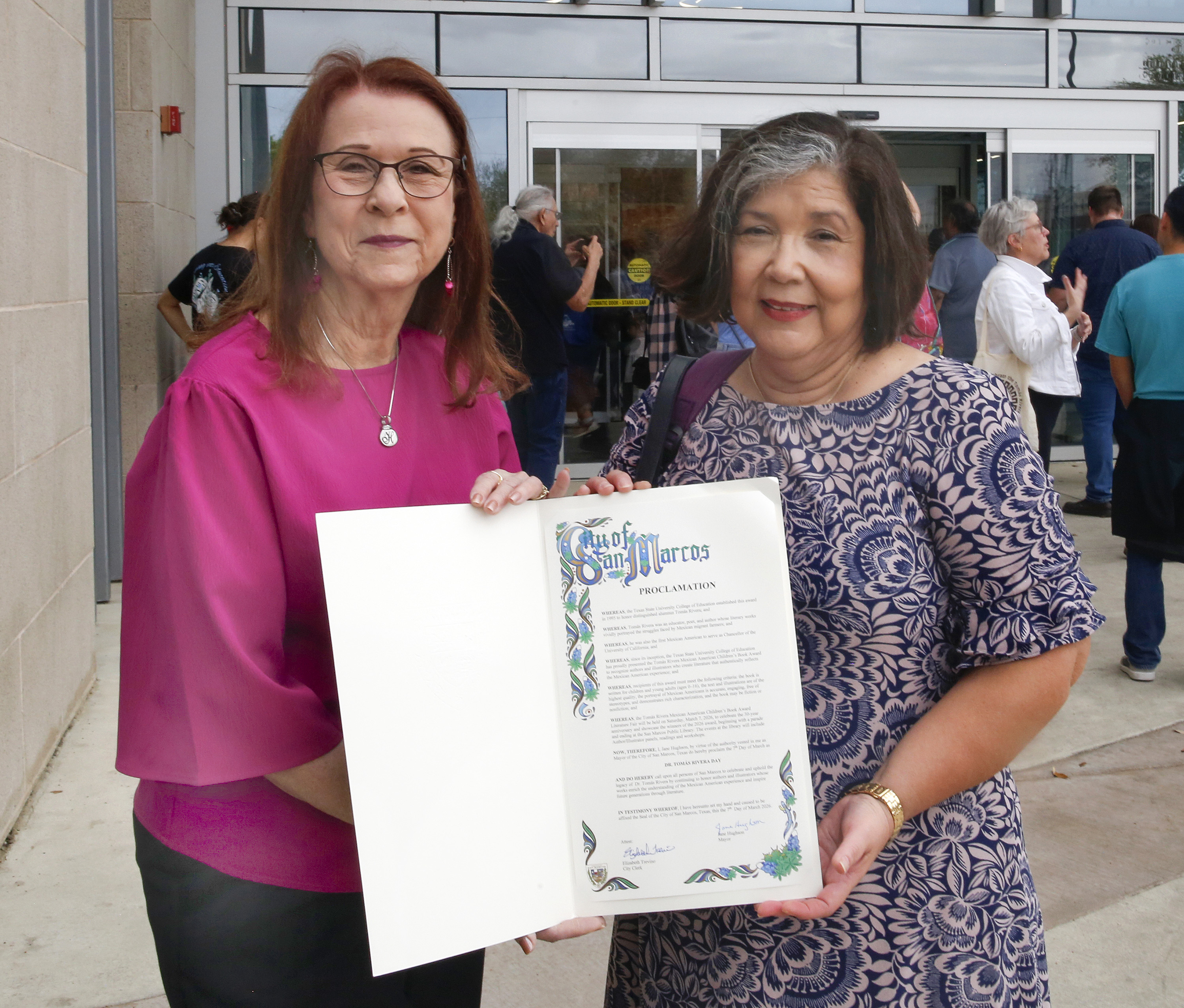 San Marcos Mayor Jane Hughson read a proclamation announcing March 7 as Tomás Rivera Book Award Day, recognizing Rivera as an “educator, poet and author whose literary works vividly portrayed the struggles faced by Mexican migrant farmers.”