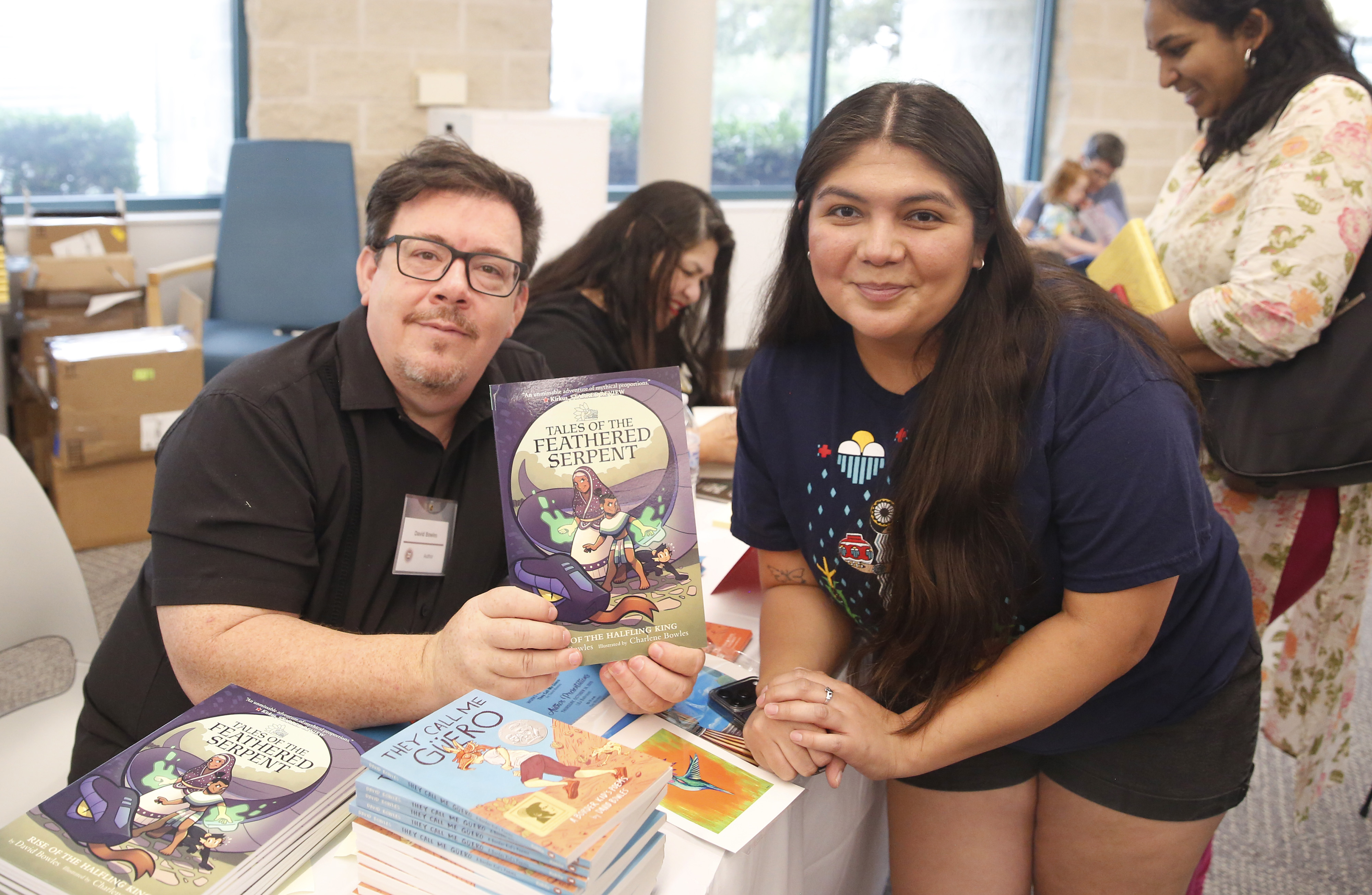 Mancia now teaches at Blazier Elementary in Austin, and was at the fair to get books for her students. Author David Bowles signed his graphic novel, “Tales of the Feathered Serpent” for Mancia, a replacement for a copy her students read over and over. “They’re obsessed with it, and so they read it so much that they wore it out. So I was like, ‘I need to get a new one.’”