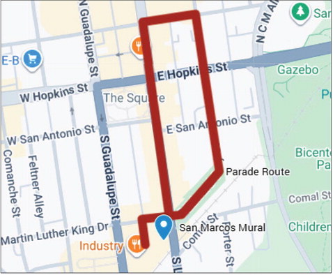 The parade will line up at 10 a.m. on April 25 at the San Marcos Mural, 110 E. Martin Luther King Dr. The parade will hit the streets at 11 a.m. There will be an afterparty at the Showdown, 207 E. Hutchison St.